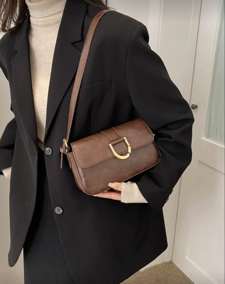 ダークブラウン ショルダーバッグ メタルデコ スクエアバッグ フラップ