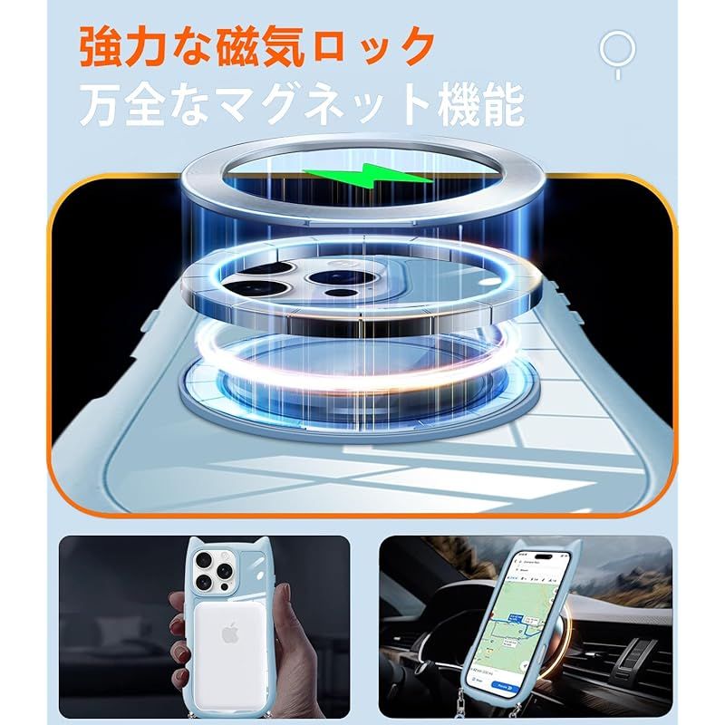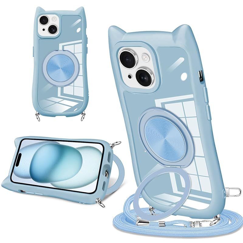 【新品】 iPhone 15 用 スマホケース 猫耳デザイン シンプルでファッション 360° 回転スタンド付き iPhone 15 スマホケース 滑り止め 黄ばみ防止 全面的な保護 長さ調節可能なネックストラップ付き 1