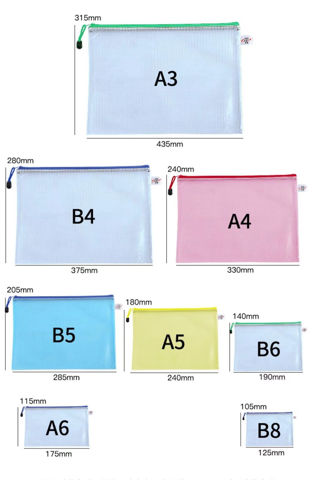 A3(43.5CM*31.5CM)、B4(37.5CM*28CM)、A4(33CM*24CM)、B5(28.5CM*20.5CM)、A5(24CM*18CM)、B6(14CM*19CM)、A6(11.5CM*17.5CM)、B8(12.5*10.5cm)