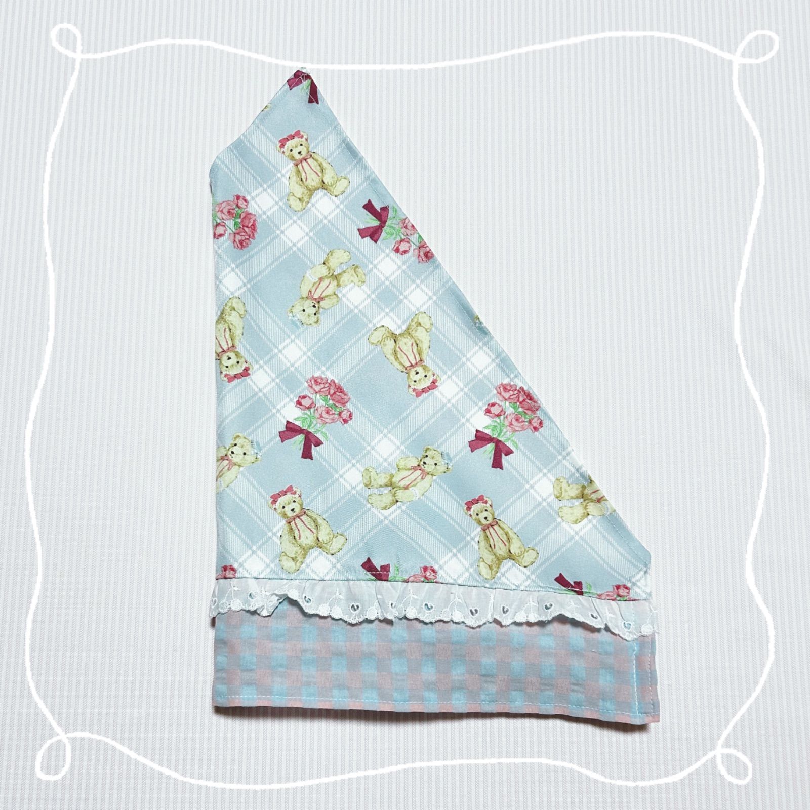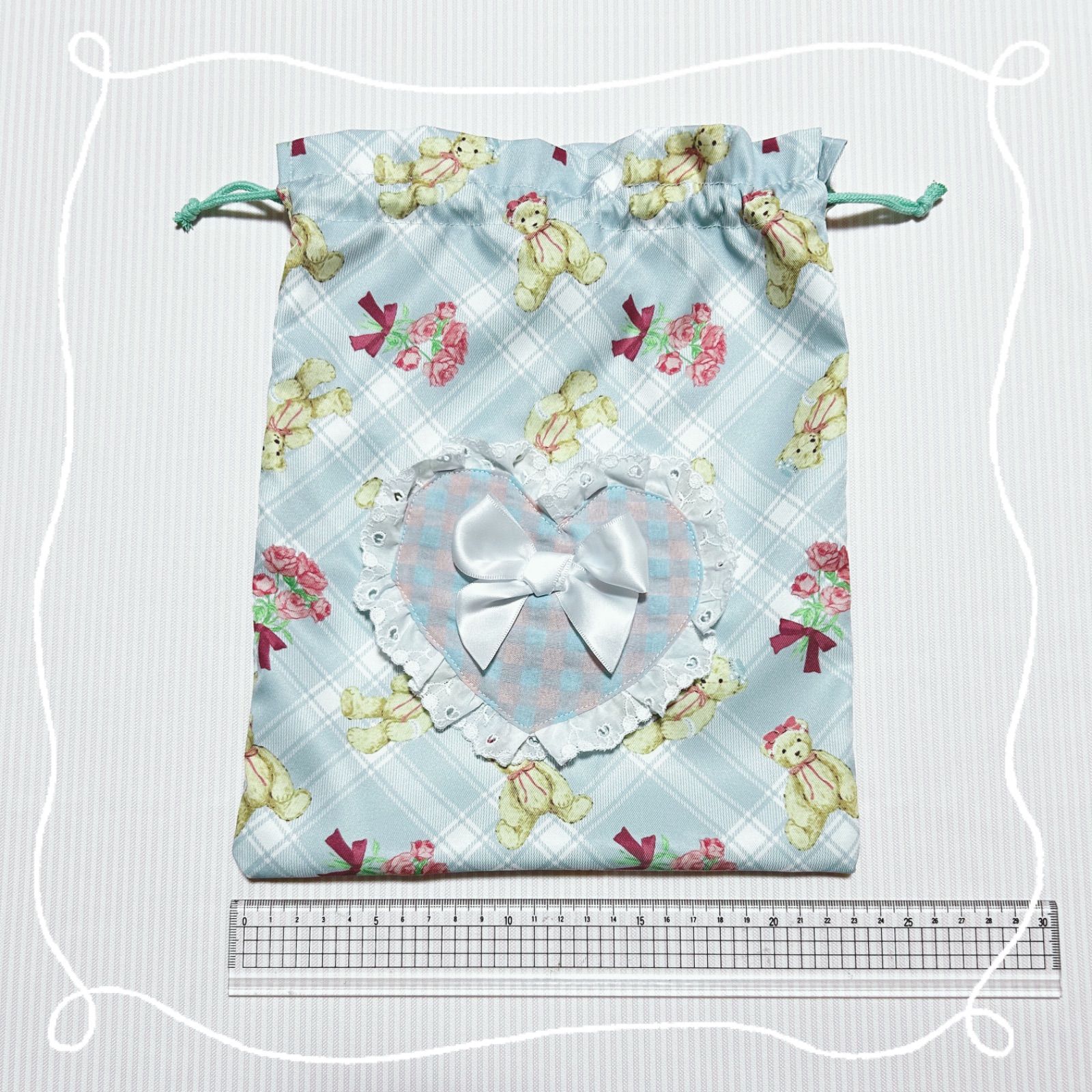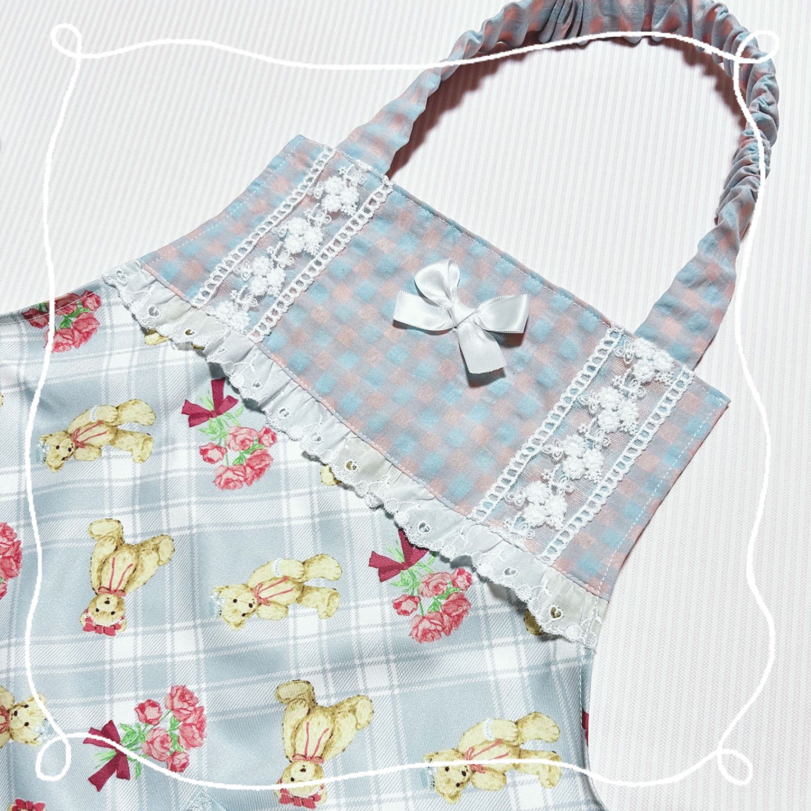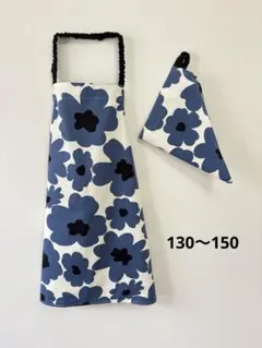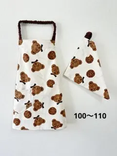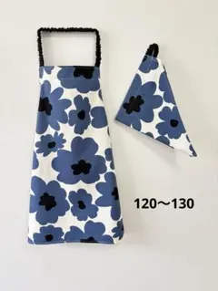 ハンドメイド キッズエプロン Mサイズ 120〜130センチ エプロン 三角巾 巾着 3点セット 水色 くまちゃん 花束柄