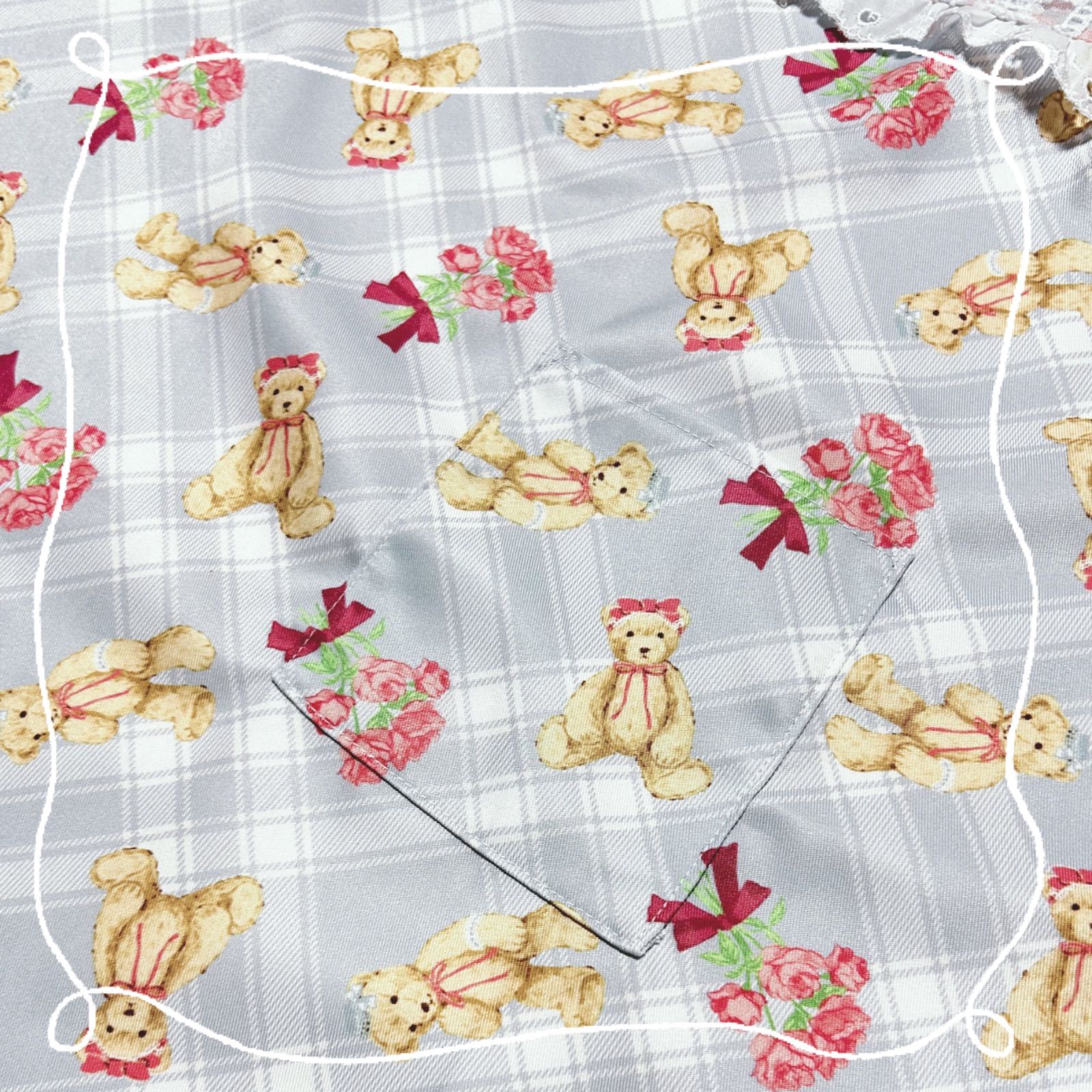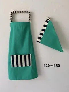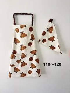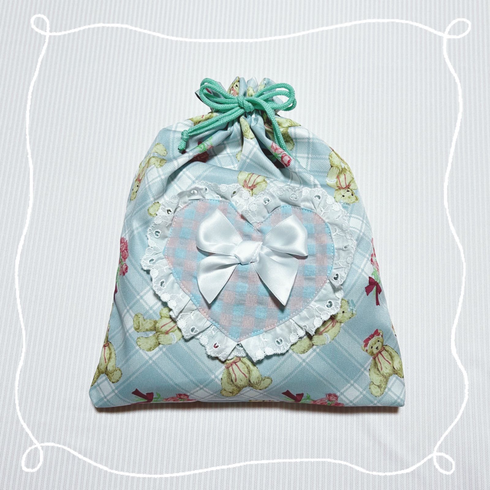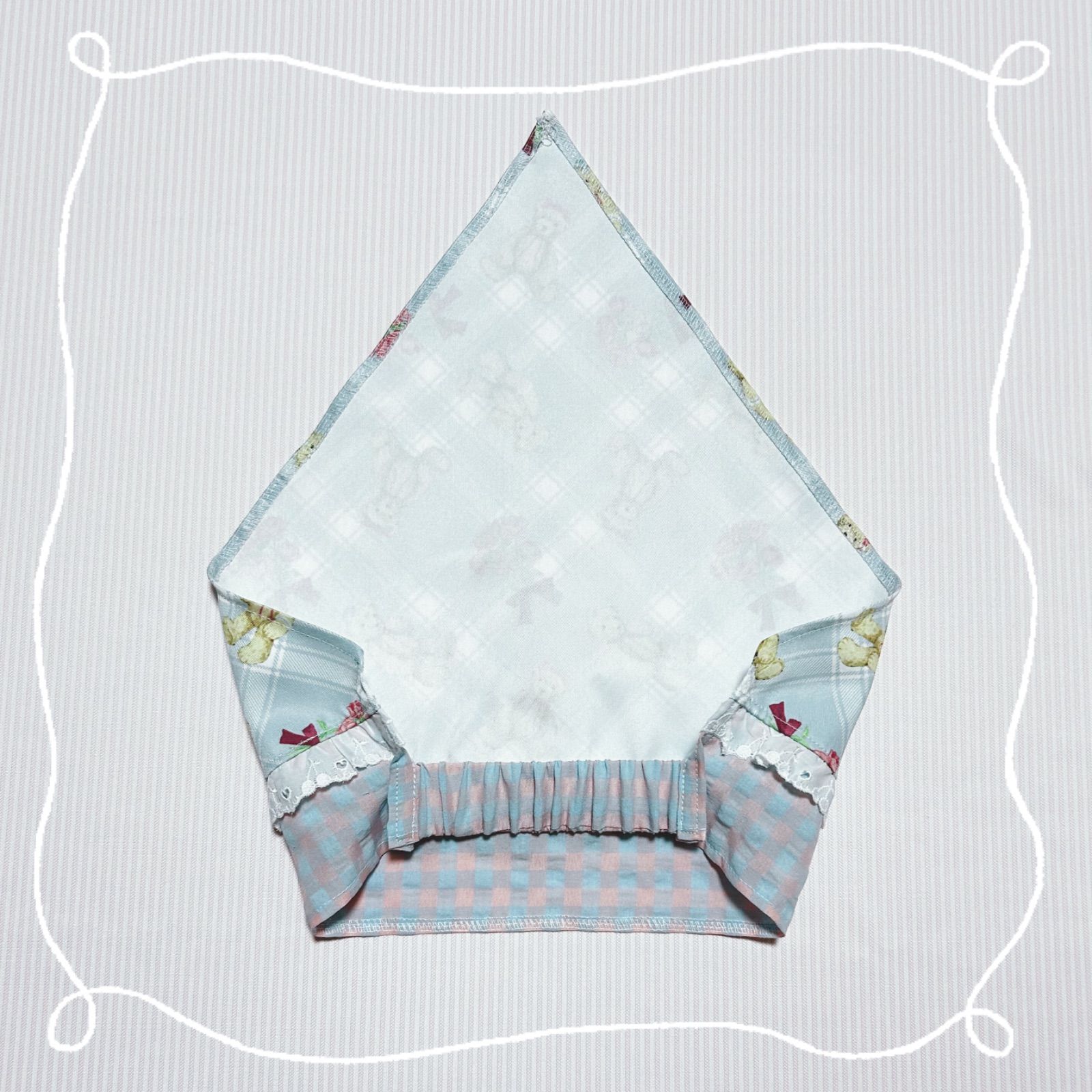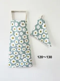 ハンドメイド キッズエプロン Mサイズ 120〜130センチ エプロン 三角巾 巾着 3点セット 水色 くまちゃん 花束柄