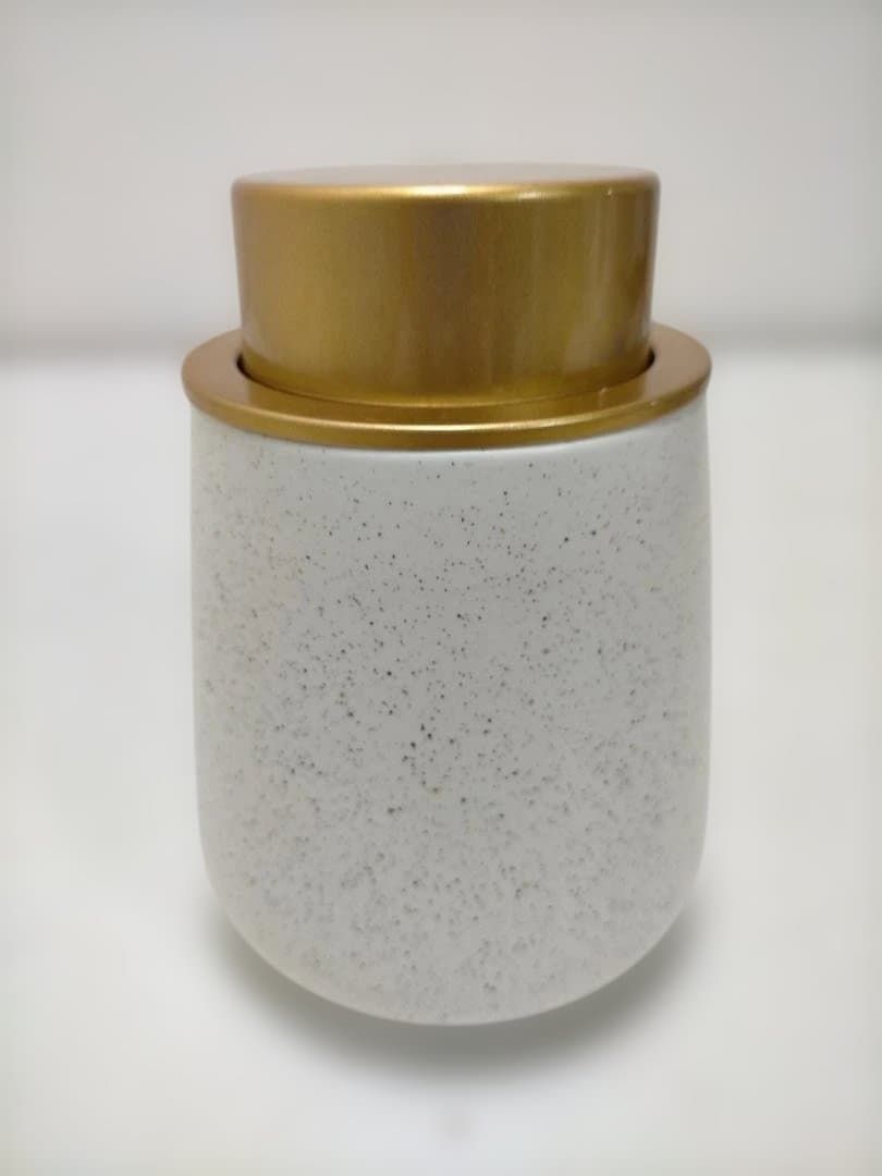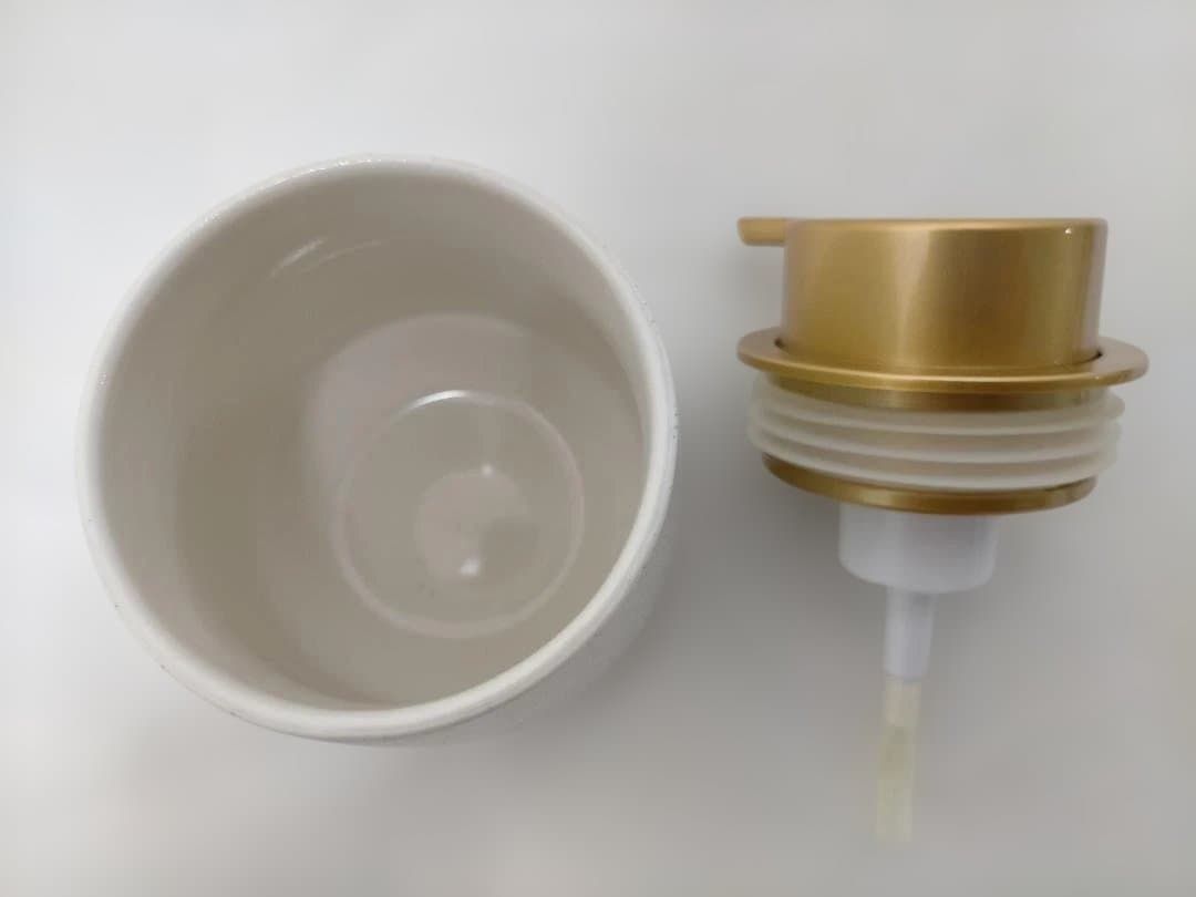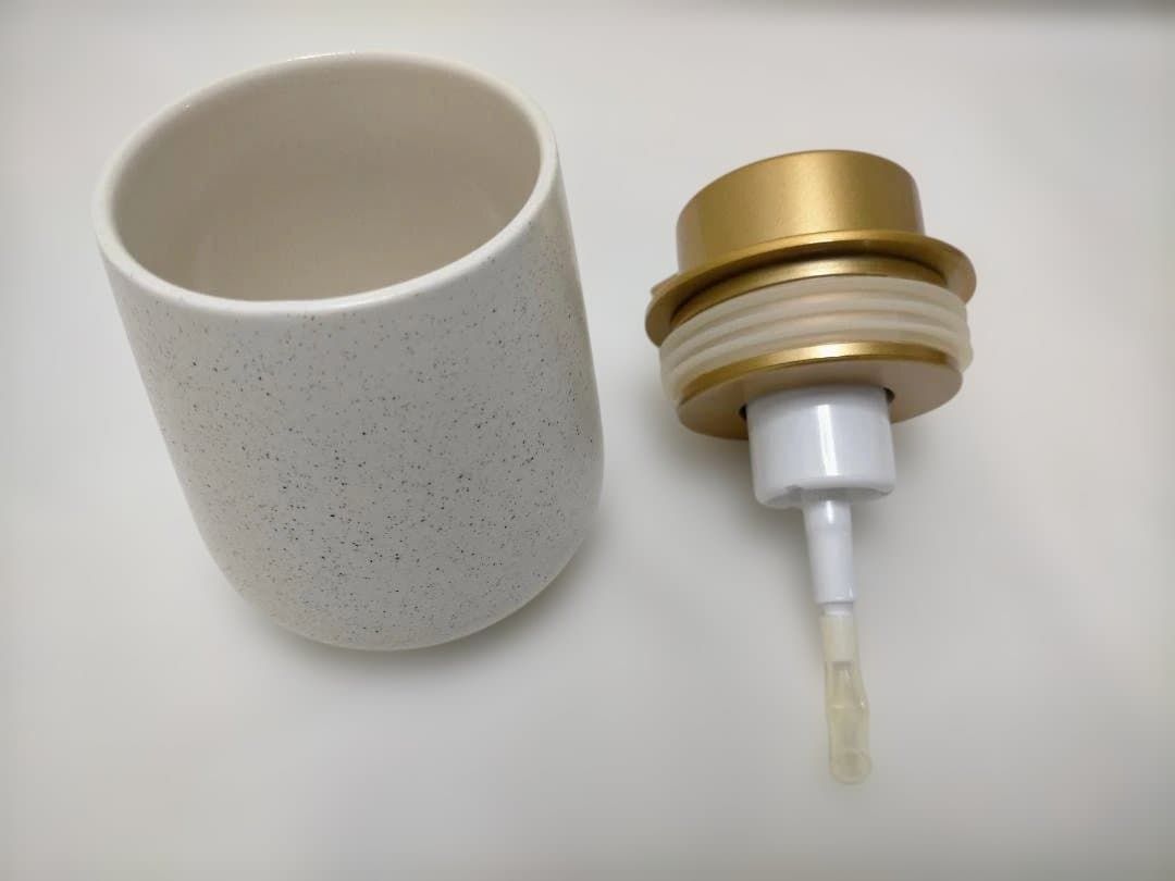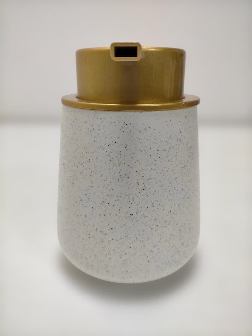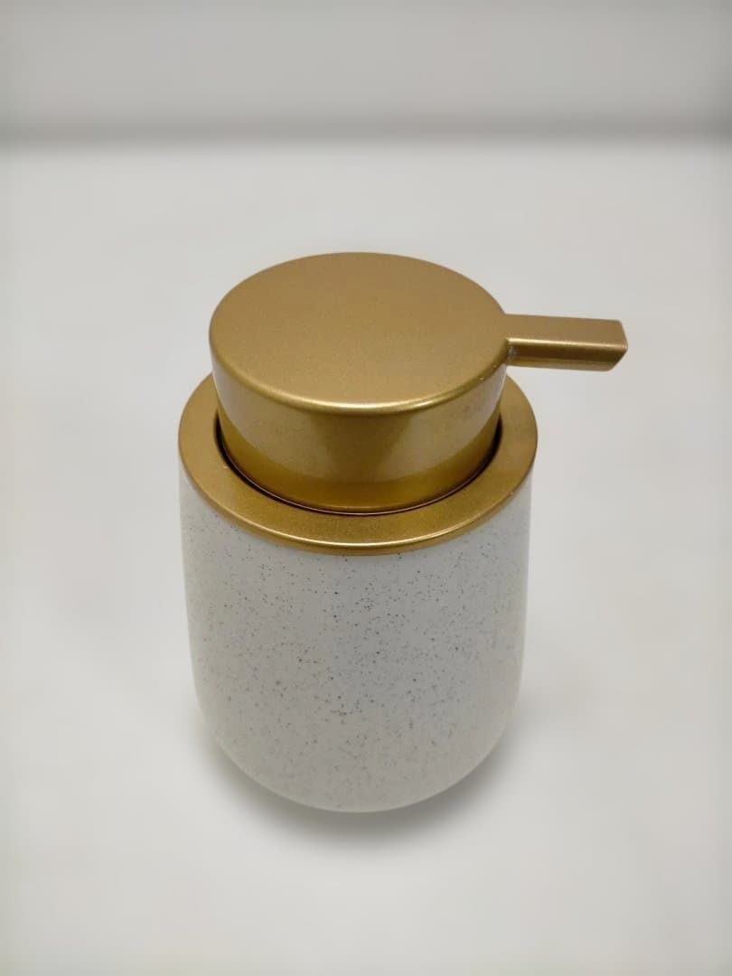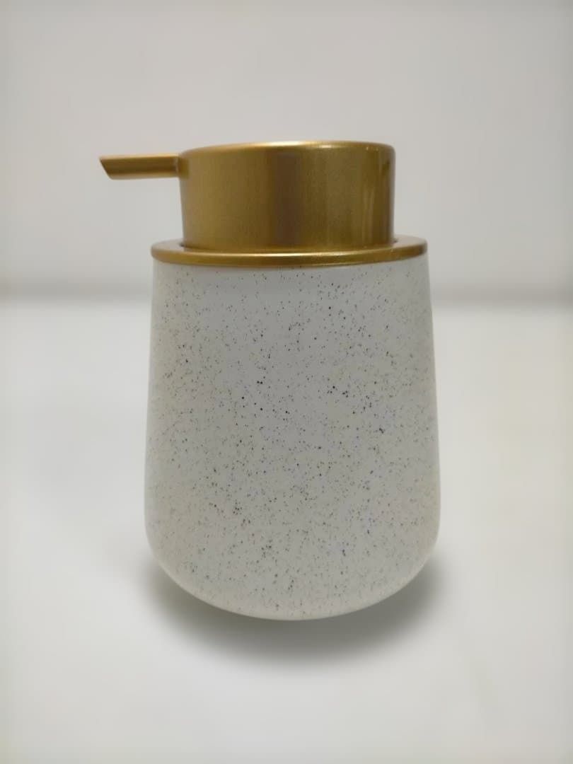 陶器風のマットな質感と高級感あるメタリックゴールドのポンプが特徴で、洗面所・キッチン・バスルームなど幅広く使えます。