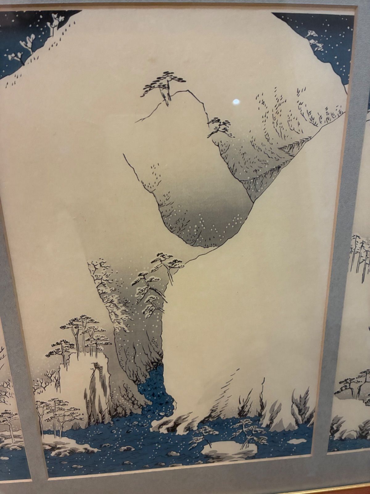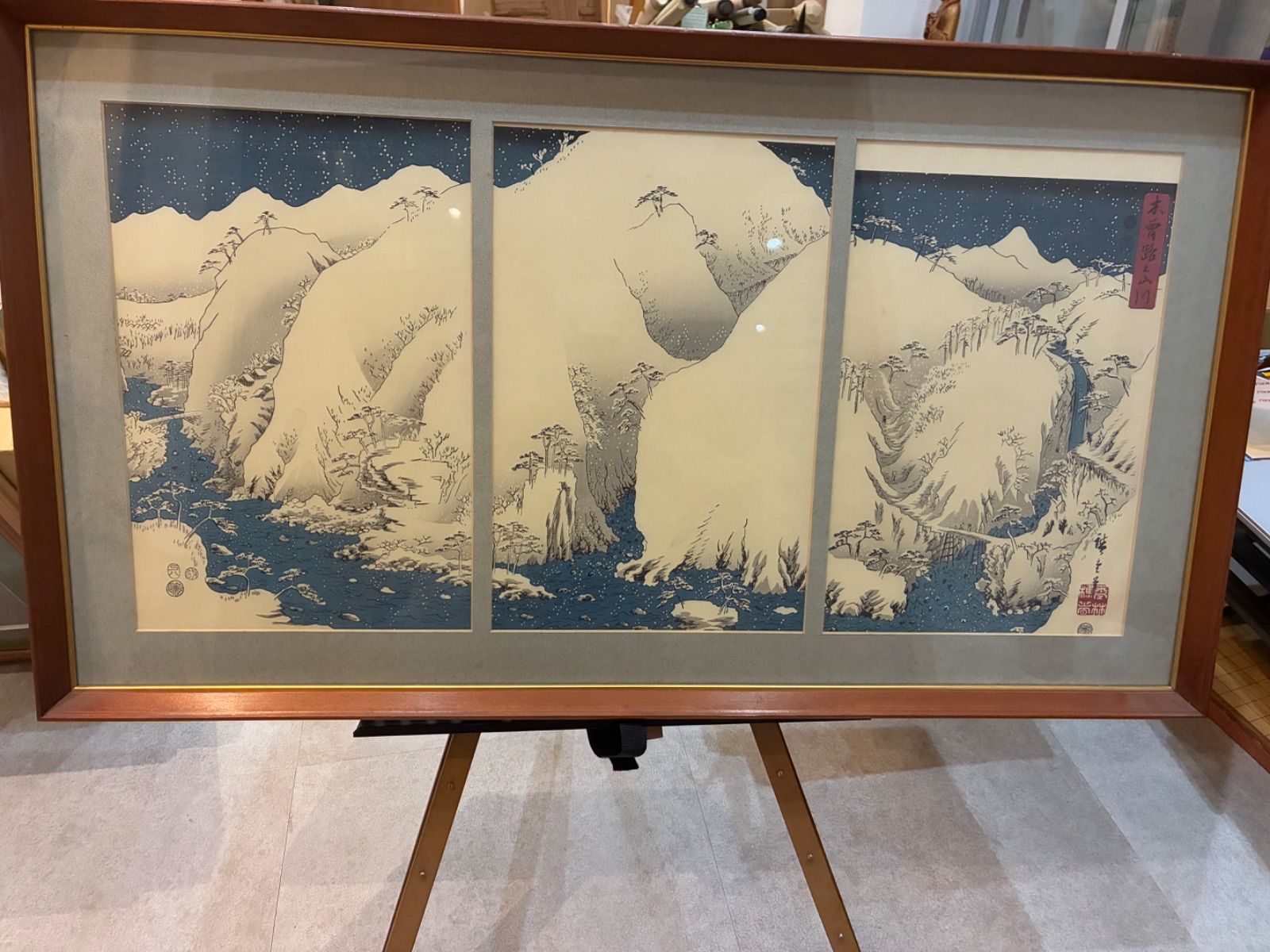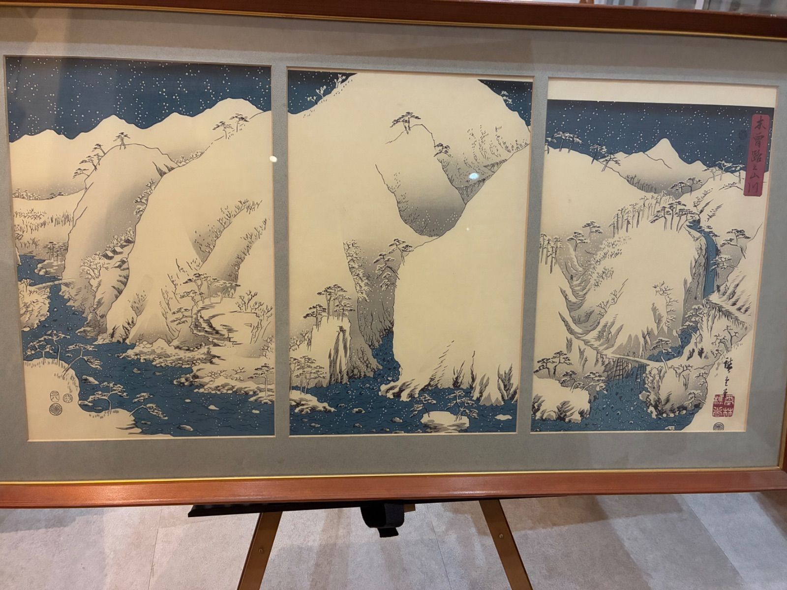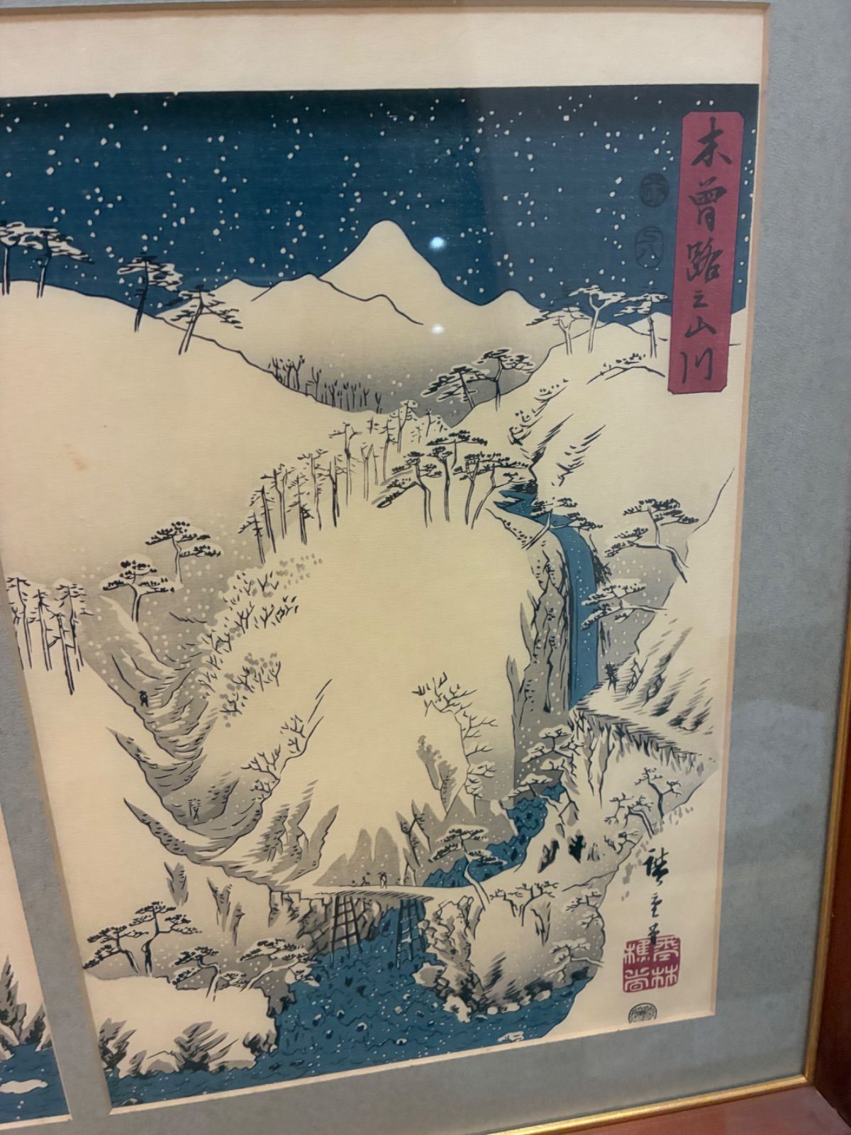 浮世絵 木版画 安藤広重 木曽路之山川 3枚組 骨董 額装 額入り