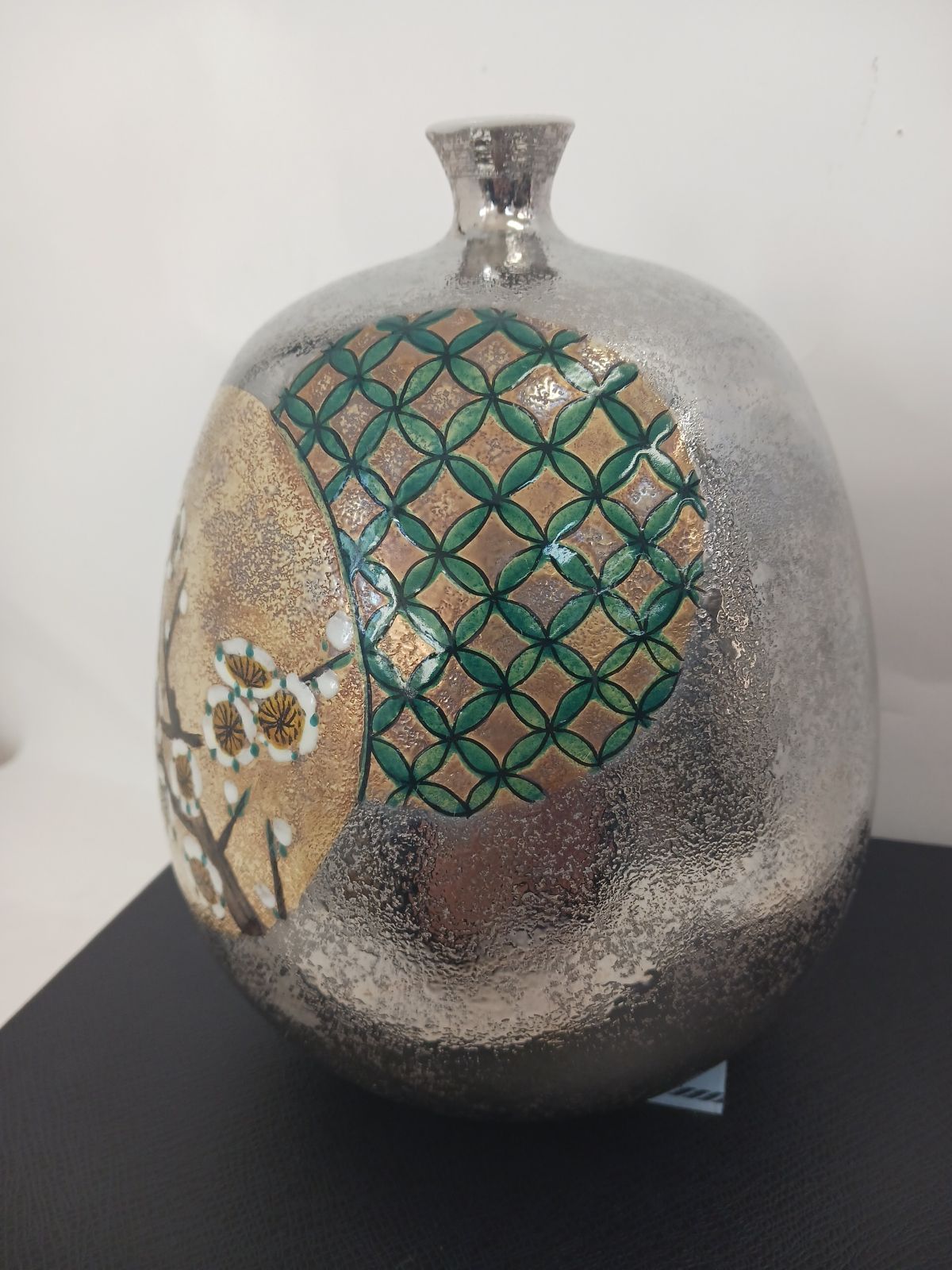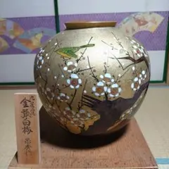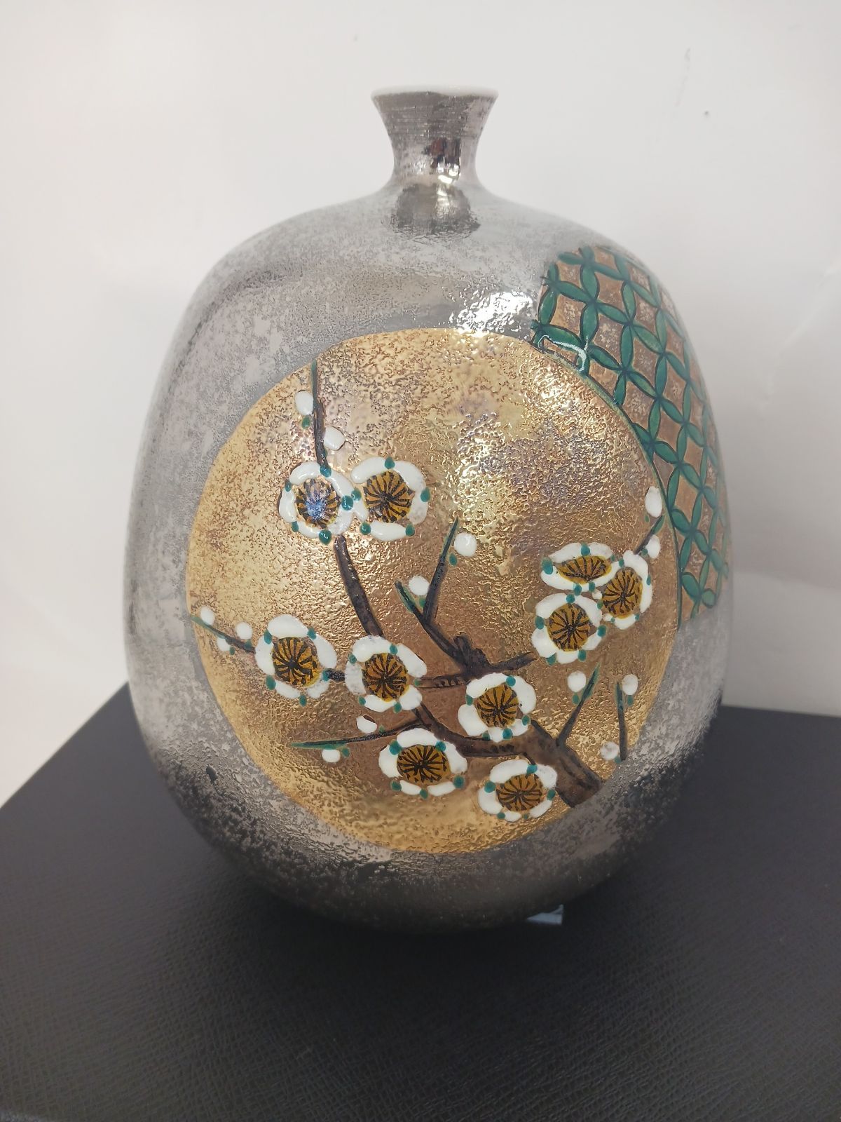 表面には銀彩調の質感が施され、正面には金地に梅の花が描かれた豪華な意匠が目を引きます。