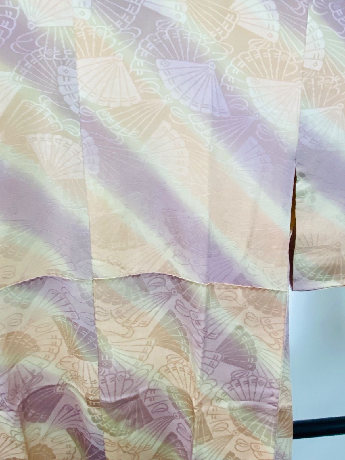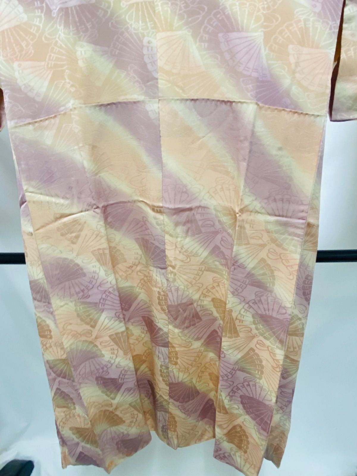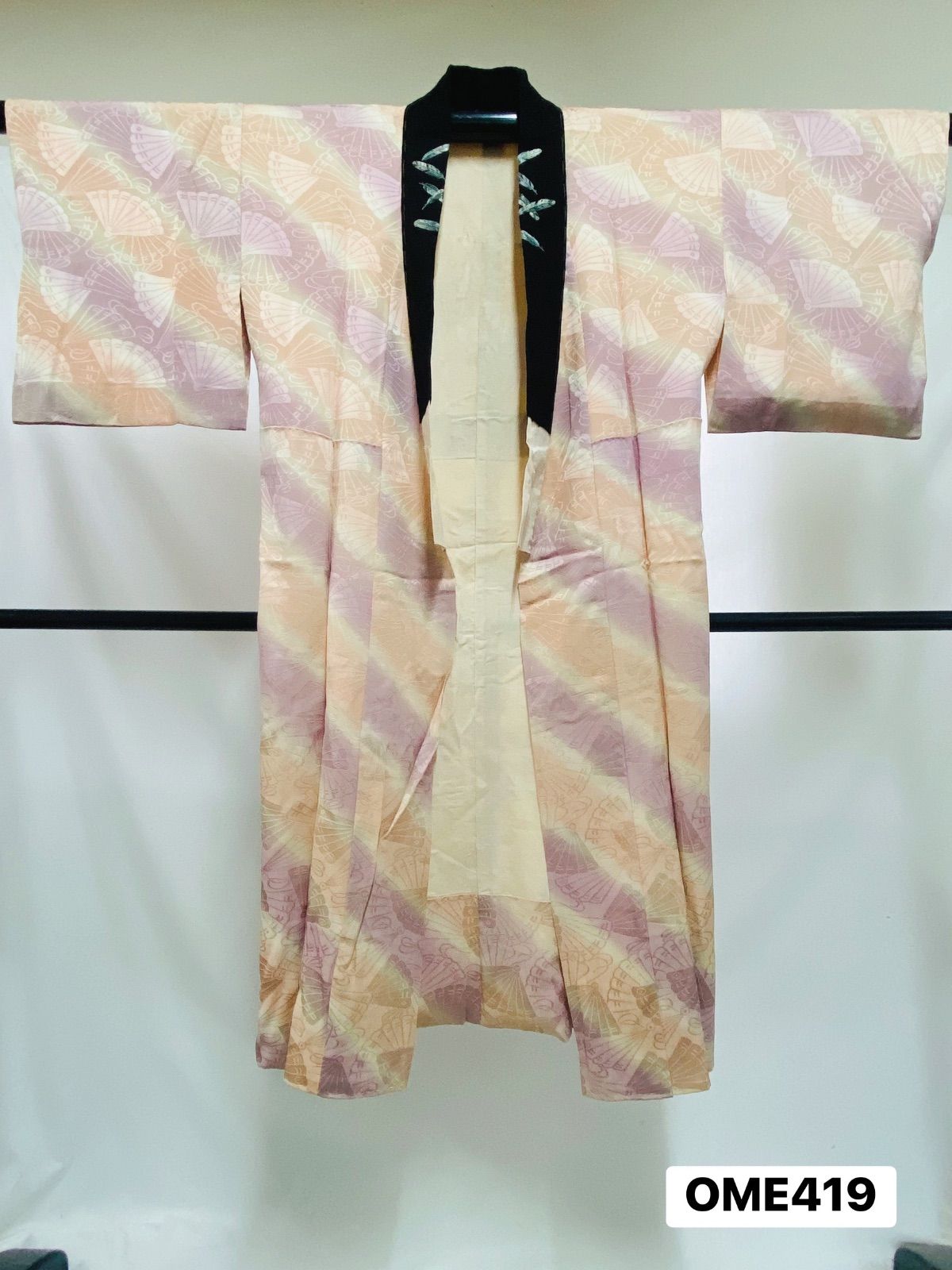 【長襦袢】アンティーク長襦袢 アンティーク 正絹 しつけ糸あり 斜め横縞模様 扇 紫 オレンジ 羽柄 着物 和装 OME419