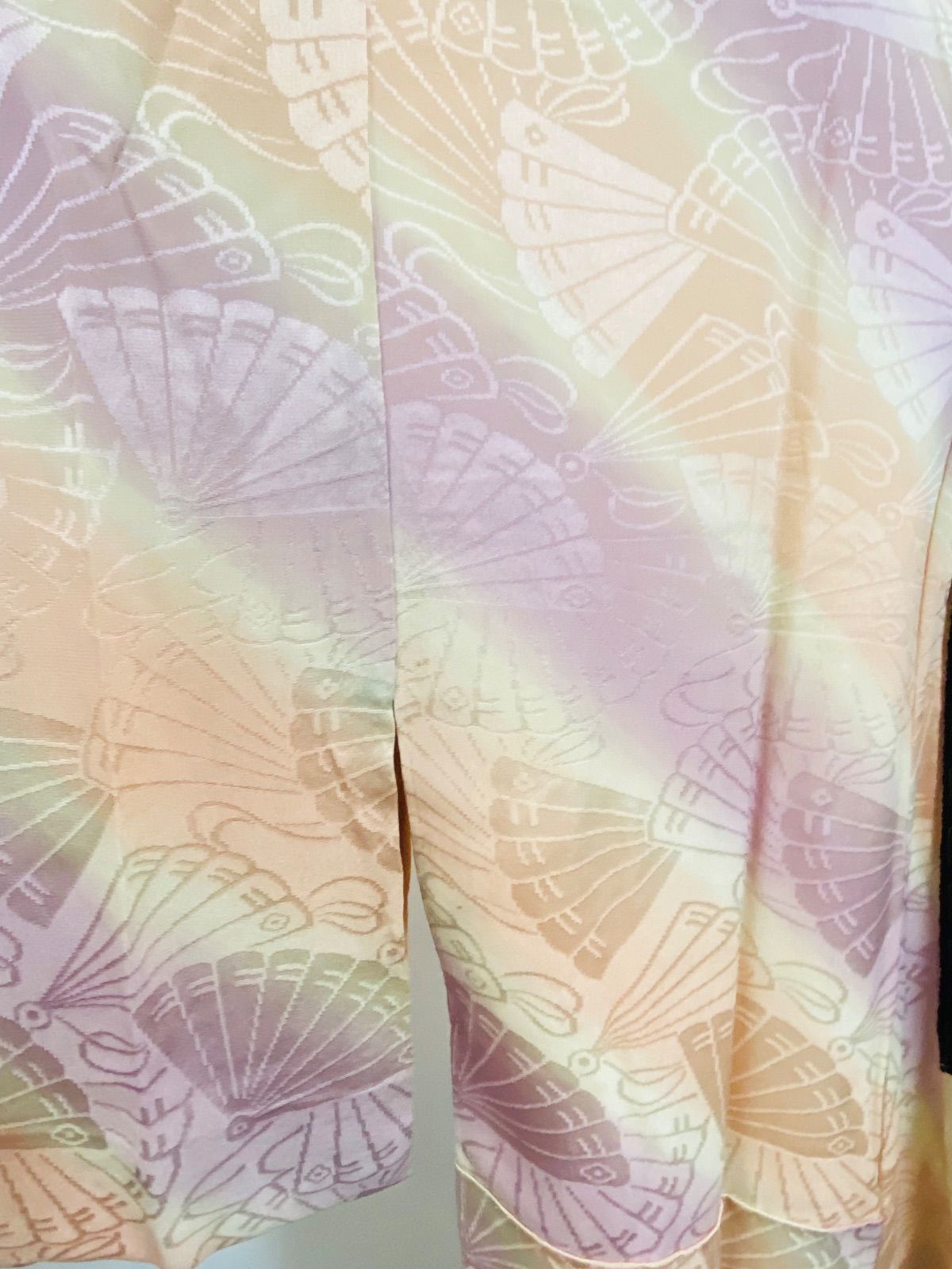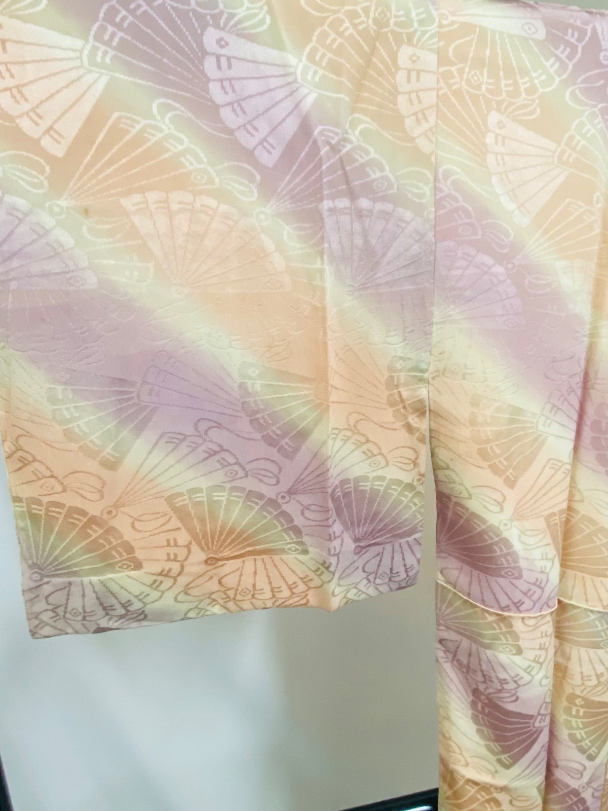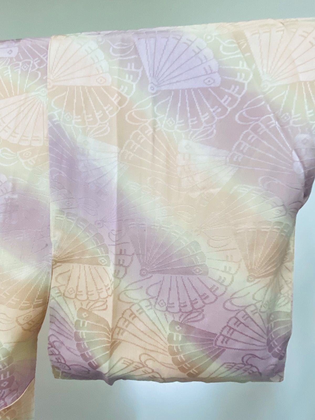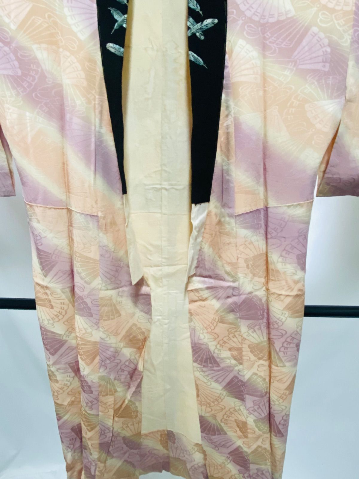 【長襦袢】アンティーク長襦袢 アンティーク 正絹 しつけ糸あり 斜め横縞模様 扇 紫 オレンジ 羽柄 着物 和装 OME419