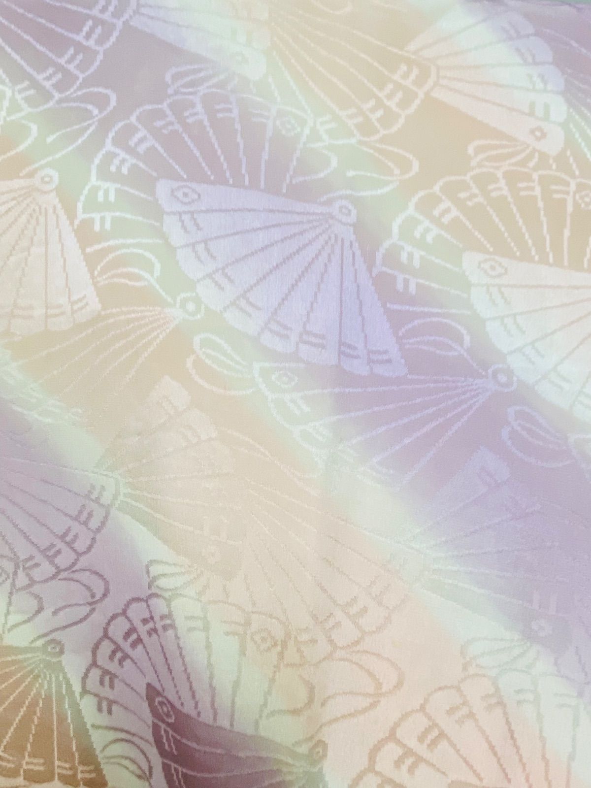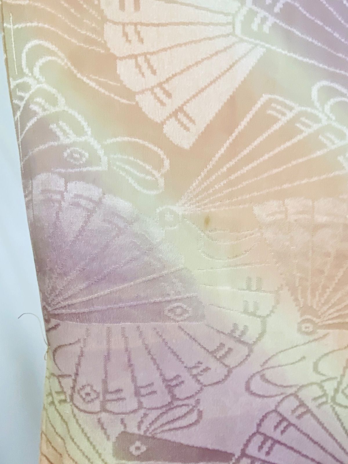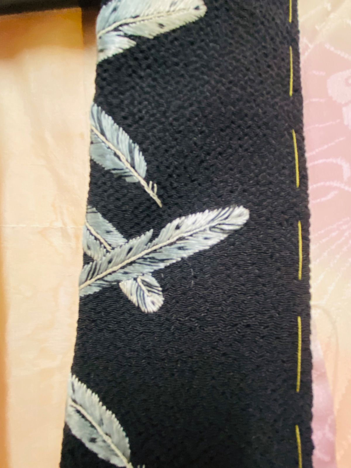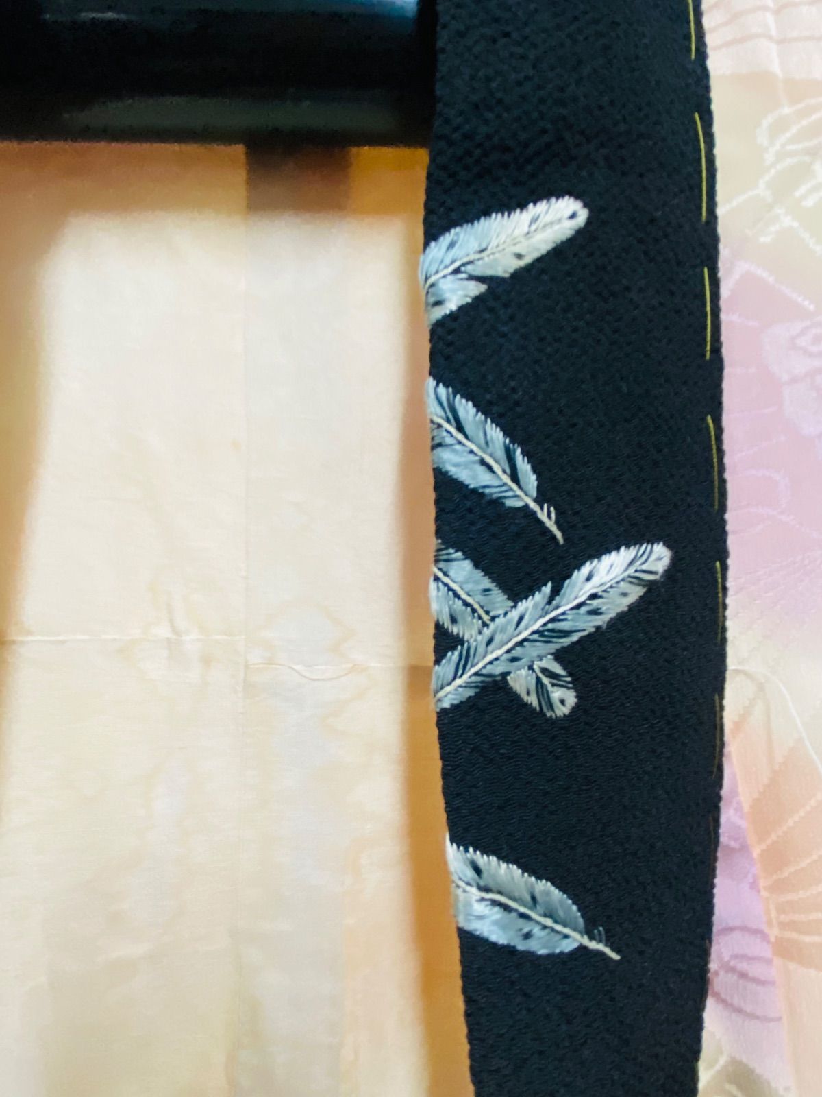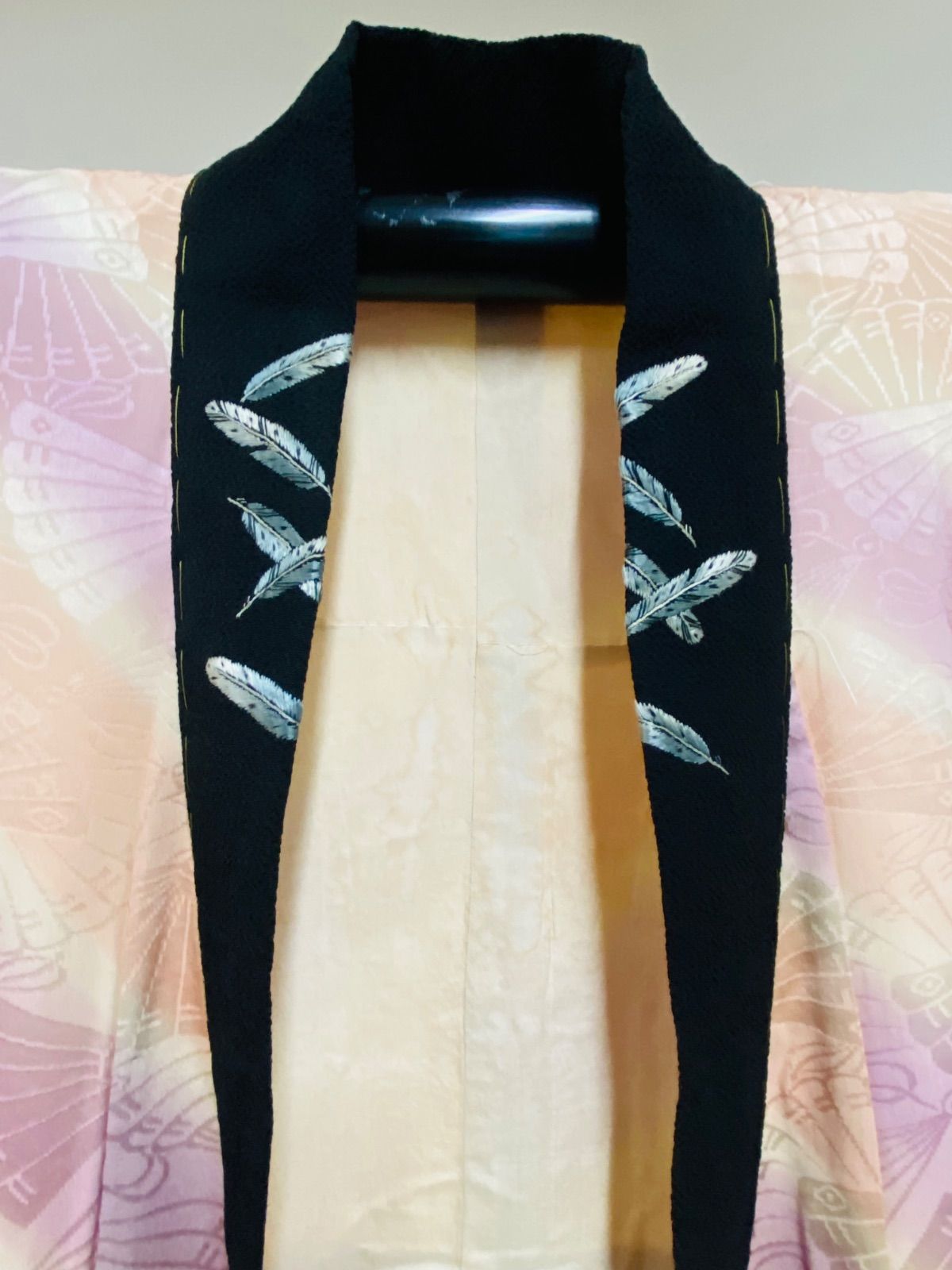 デザイン 斜め横縞模様、扇、襟に羽柄の刺繍