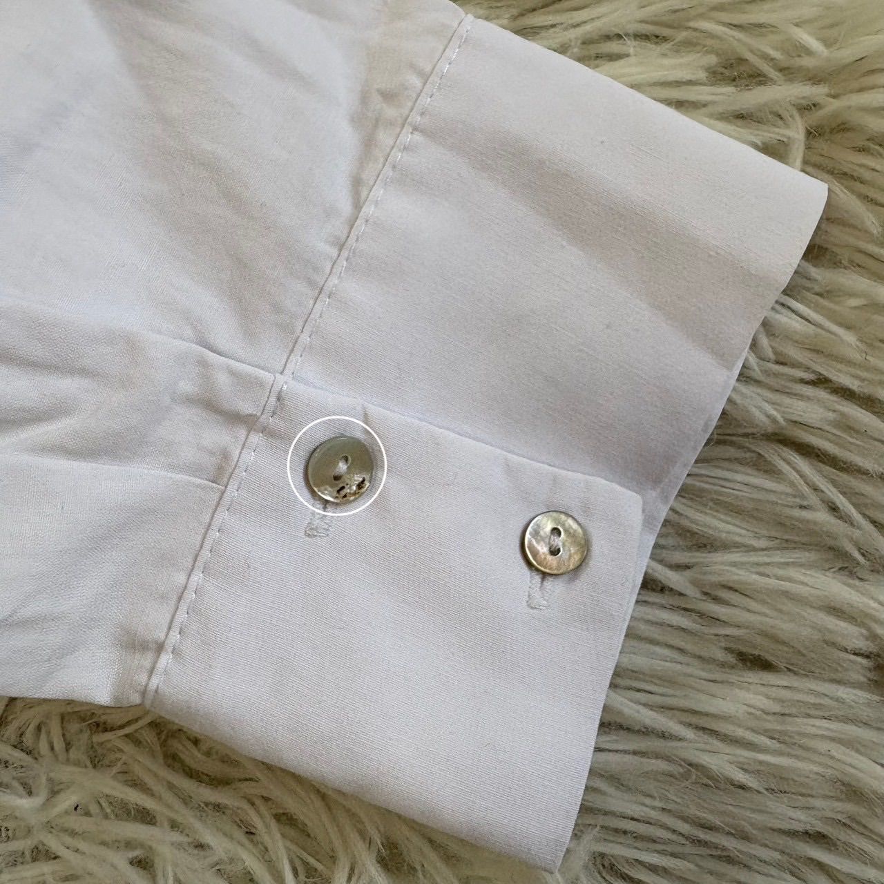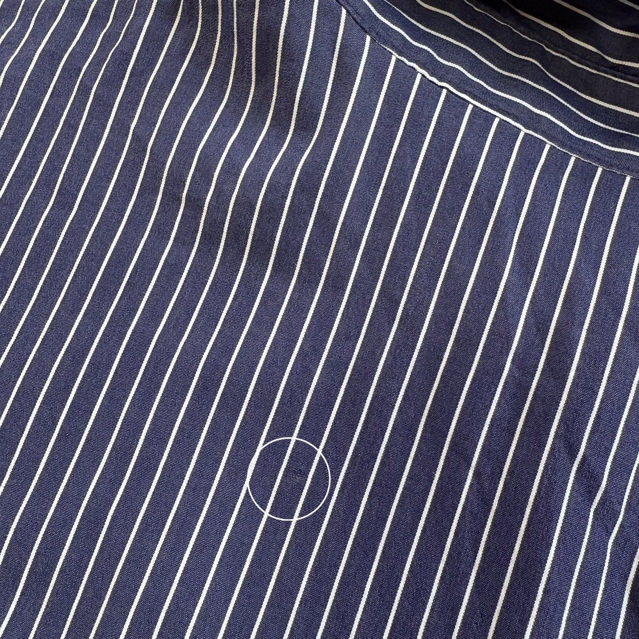 ・シャツ 首元黄ばみ有り、正面中央にシミ有、左袖ボタン汚れ有り