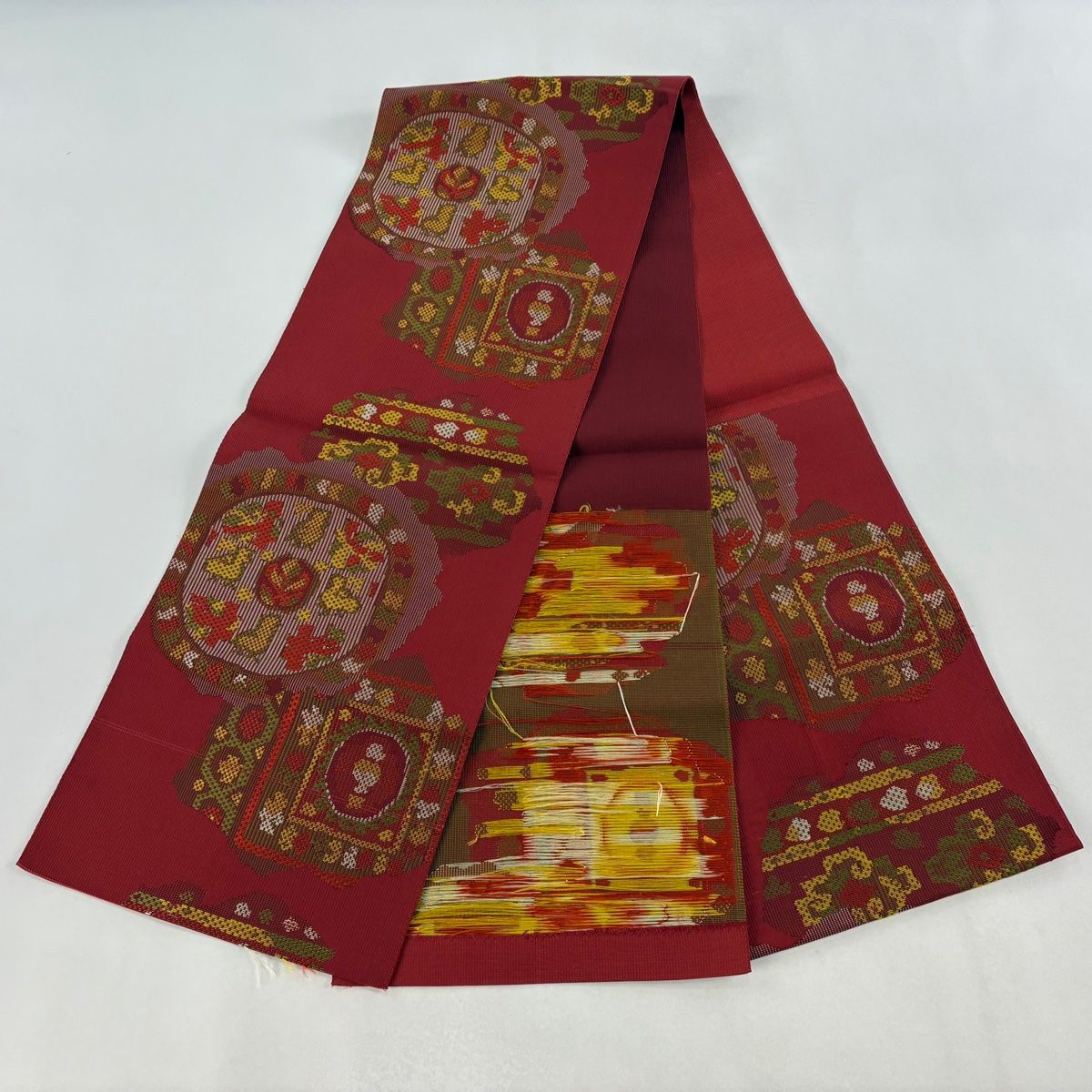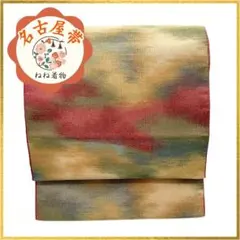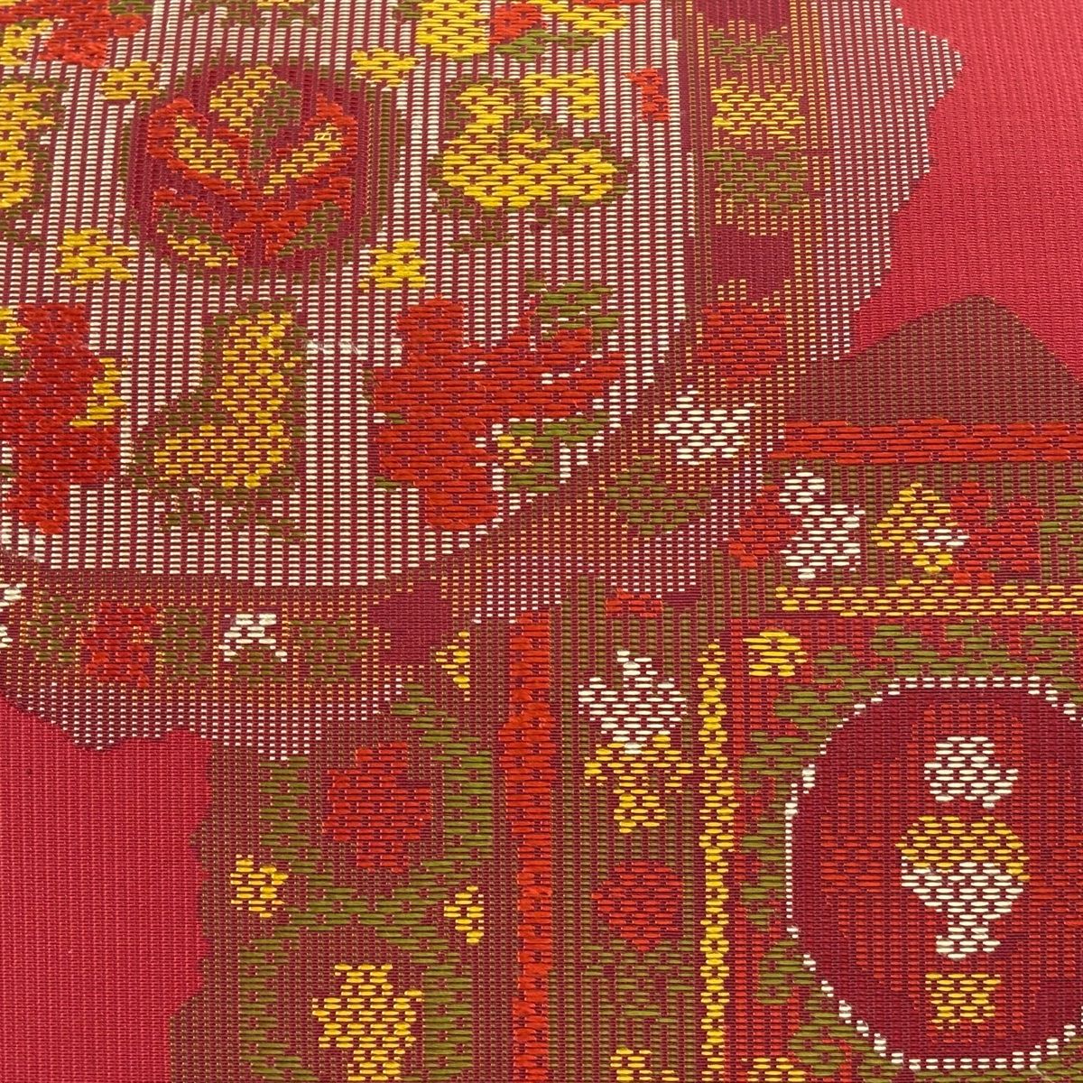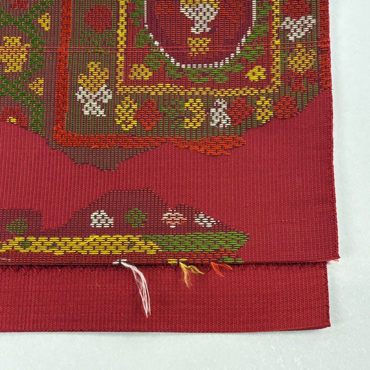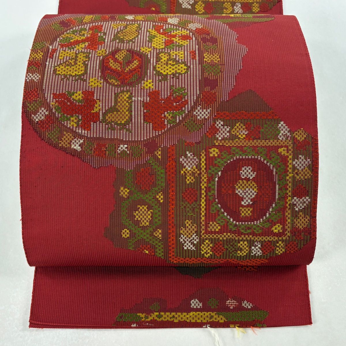名古屋帯 優品 八寸名古屋帯 草花 鳥 赤 正絹 【中古】