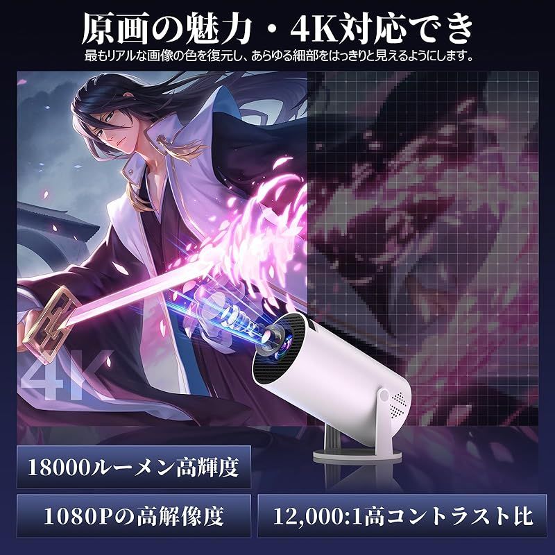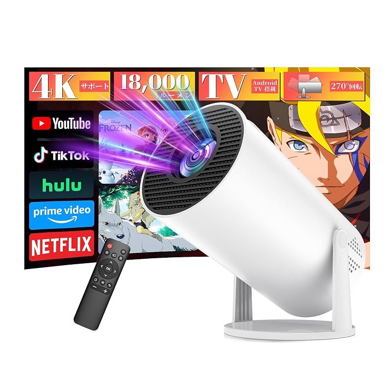 PliPla プロジェクター 家庭用【270°回転・18000LM・4K対応・Android TV搭載 最新登場! PSE認証済み】 プロジェクター 小型 高輝度 リアル1080P 天井投影 Wi-Fi6瞬間接続 Bluetooth5.4 HiFiスピーカ 1