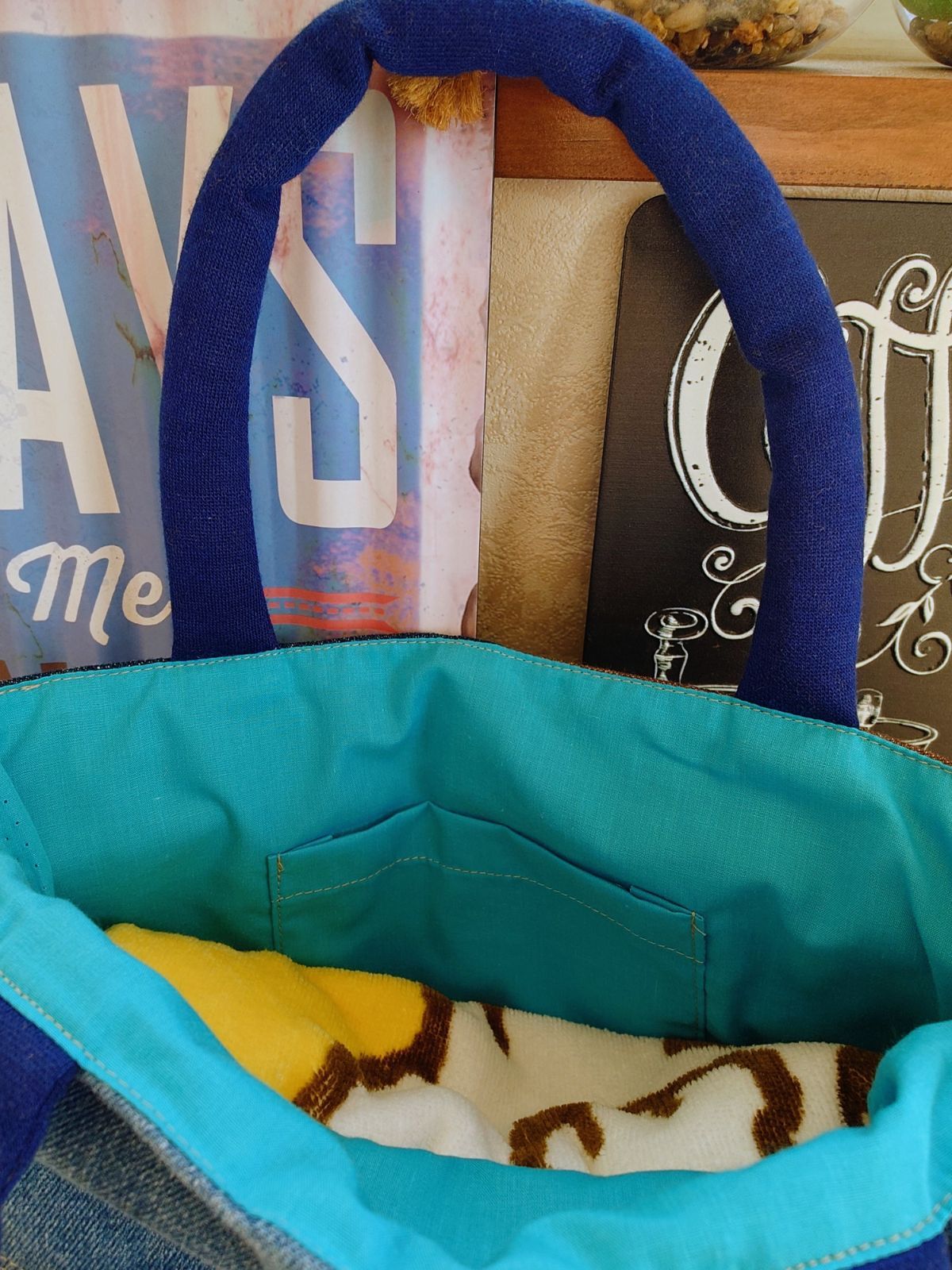 裏地はブルー系のコットンで中にはポケットがあります。