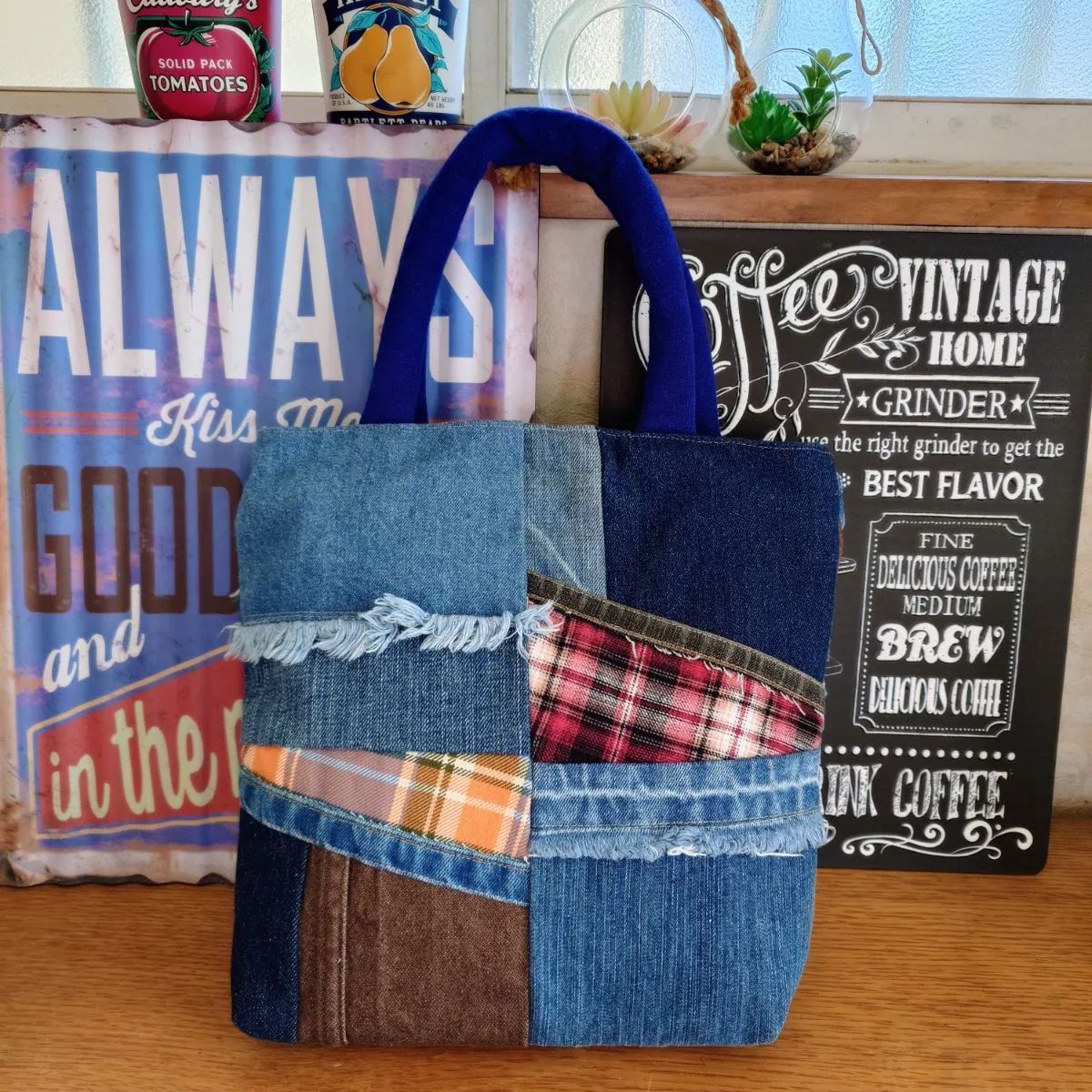 デニムとシャツをパッチワークしていて、カジュアルでありながらスタイリッシュな印象を与えます。ハンドメイドのため、独自のデザインが楽しめます。
