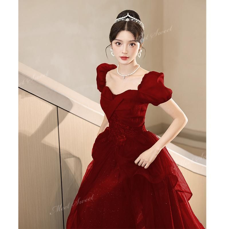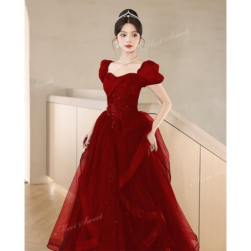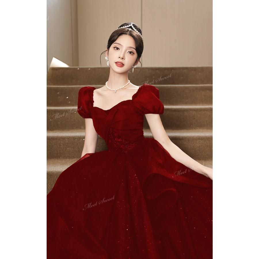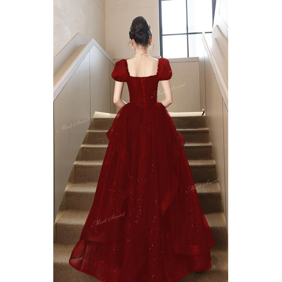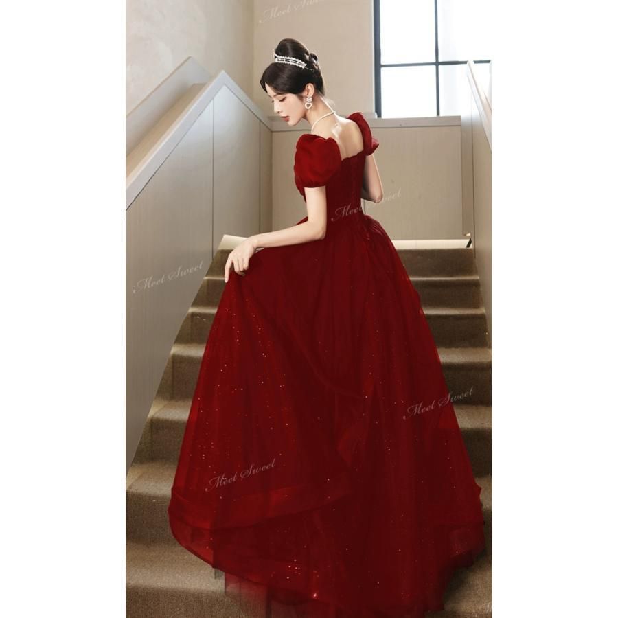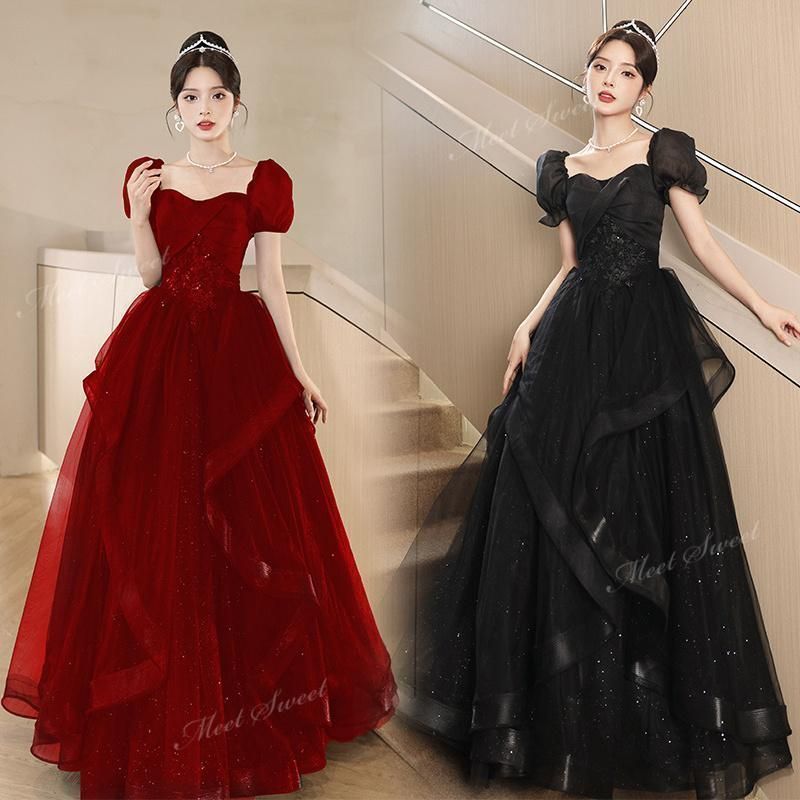 カラードレス ブラック ワインレッド パフスリーブ 前撮り 二次会 ウェディングドレス ウエディングドレスドレス 演奏会 結婚式 音楽会 発