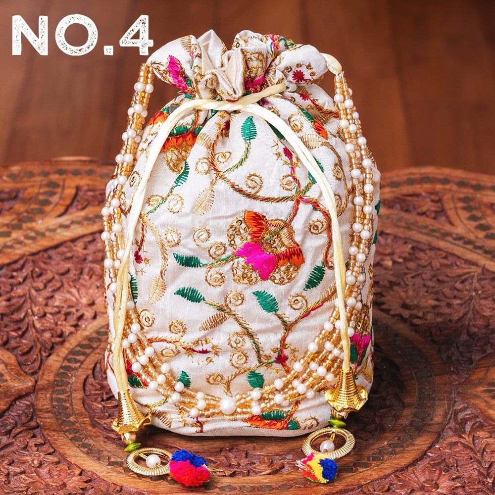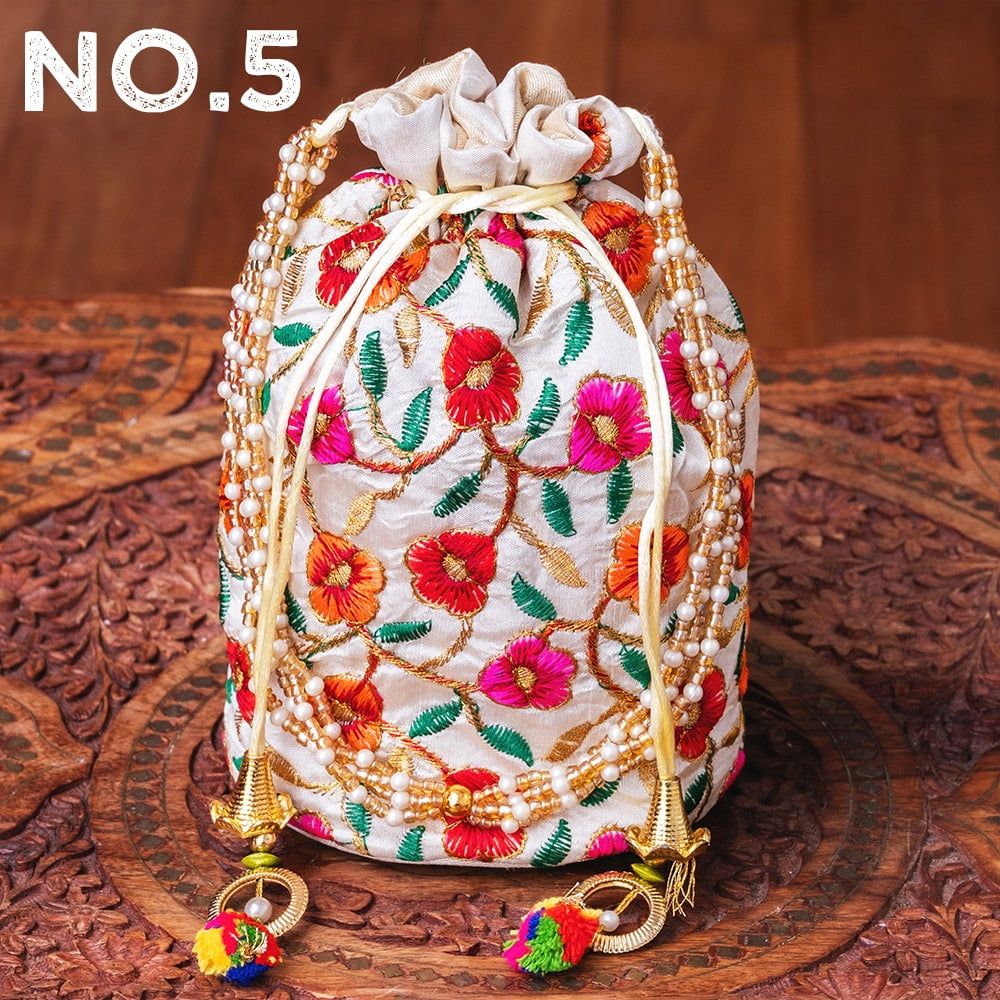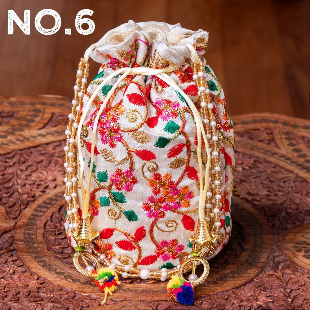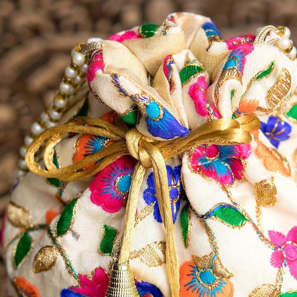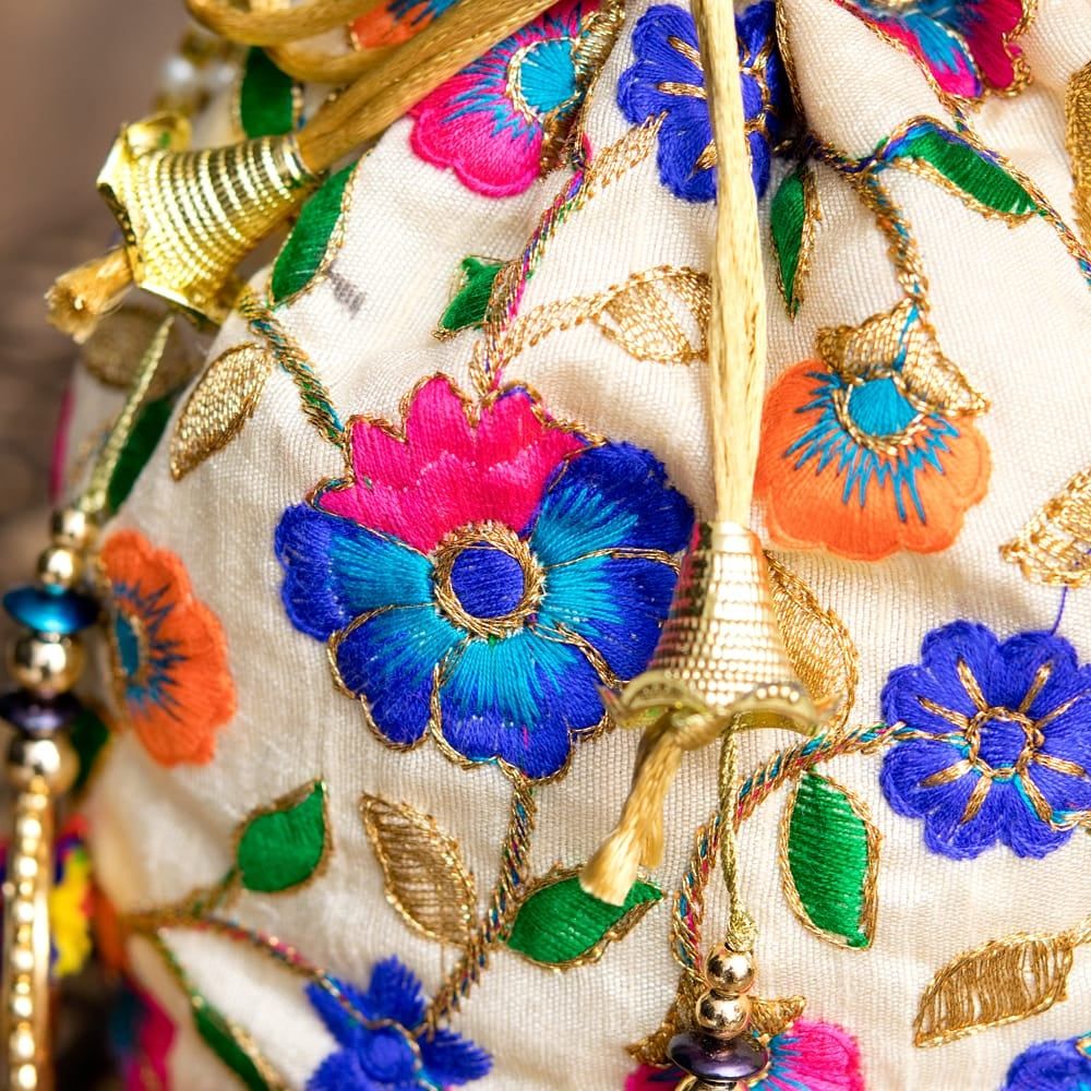 インドのきらきらミニバッグ・サリー等へオススメの巾着 フラワー更紗刺繍系 / ポトリバッグ ハンドバッグ インド バッグ