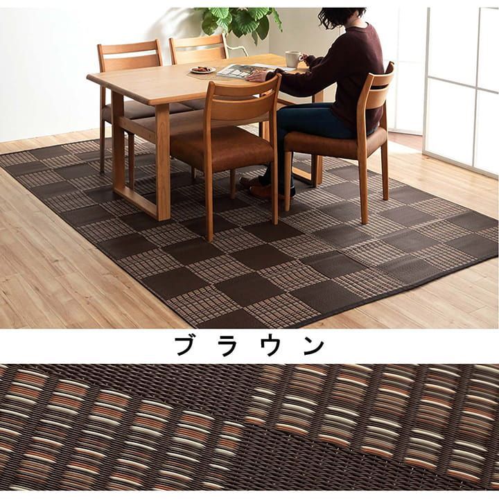 細いストロー状のような素材を細いパイプ状にして織り込んだ敷物です。 強度が高くしっかりとしています。 汚れても水洗いができるので、いつでも清潔にお使い頂けます。 カビが発生しない素材なので、カビを食するダニなども寄り付きにくいです。 一般的な除菌スプレーで拭いても色落ちせず、常に清潔な状態を保つことができます。 繊維が毛羽立つことが無く、埃が出にくく、日頃のお掃除が楽になります。 リビング、ダイニング、お子様のお部屋、など様々なシーンで活躍します。