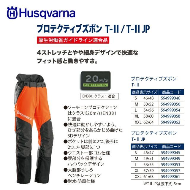 [XL 594999057]Husqvarna ハスクバーナ チェーンソー防護服・ワークウェア プロテクティブズボンT-II 5949990xx 日本人向け仕様