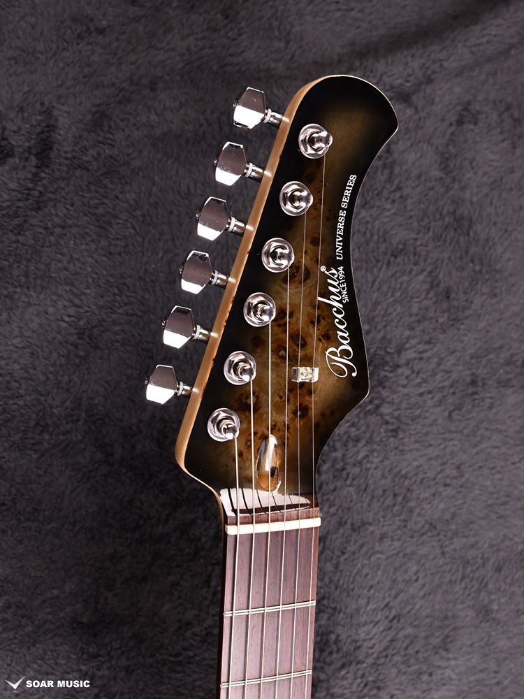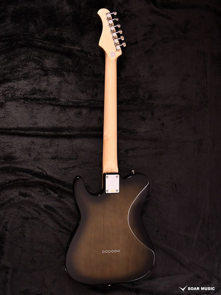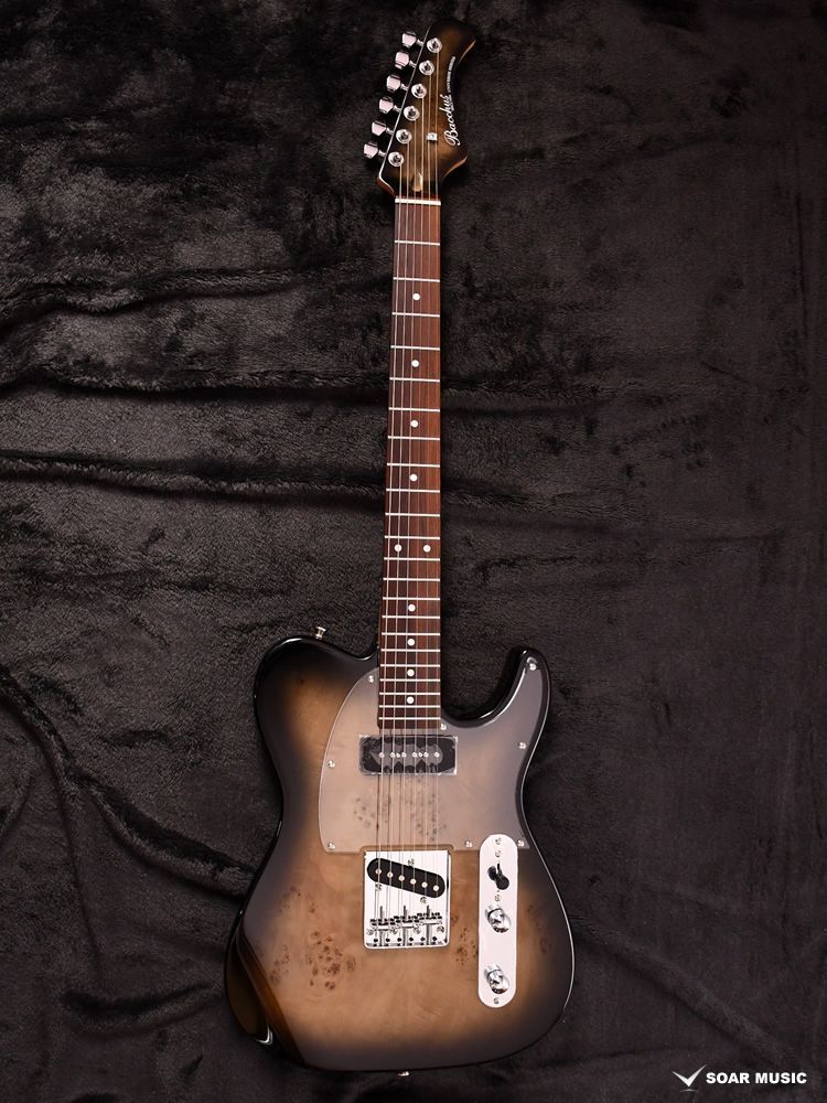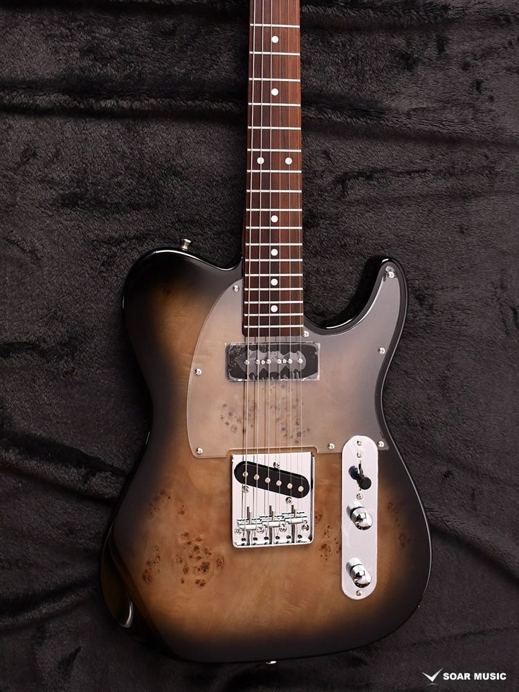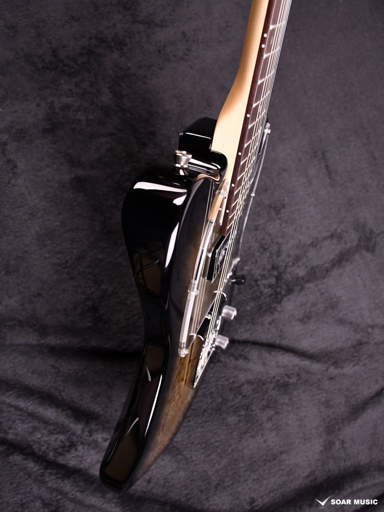 エキゾチックな杢目を邪魔しないようクリアピックガードを搭載し、雰囲気のあるバーストカラーで塗装されています。