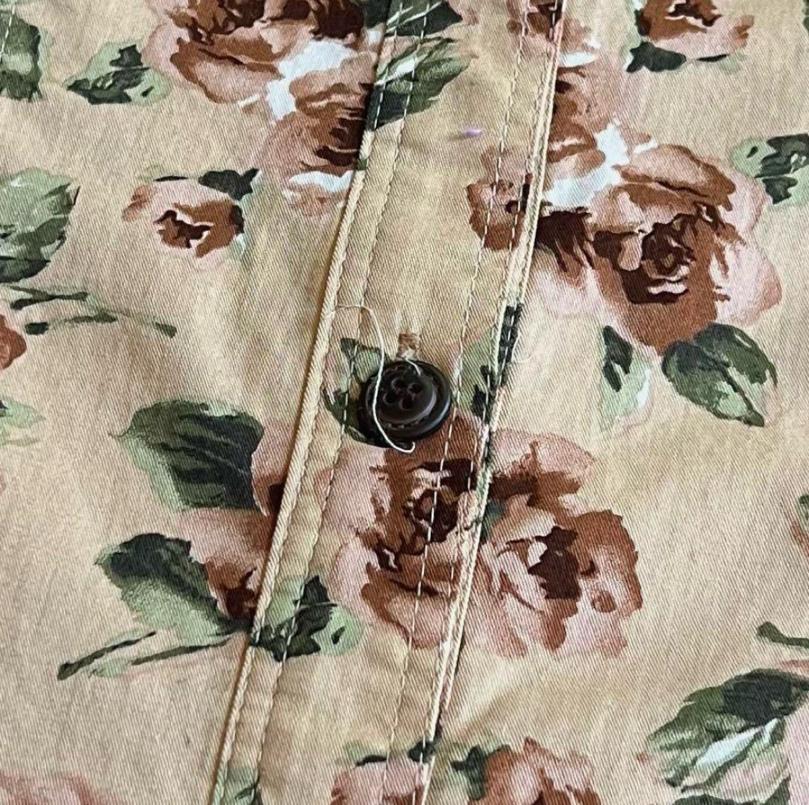 全面にバラのようなフラワーモチーフが大胆にプリントされた総柄デザイン。襟のワンポイントロゴ刺繍、裾のスエードタグもポイント。