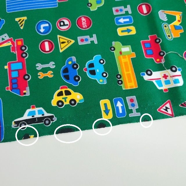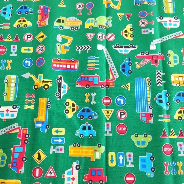 シワや乗り物柄のグリーンは生地端にプリント汚れがあり、迷彩は縦に薄い筋のラインが入っておりますのでご理解の上、ご購入お願い致します。