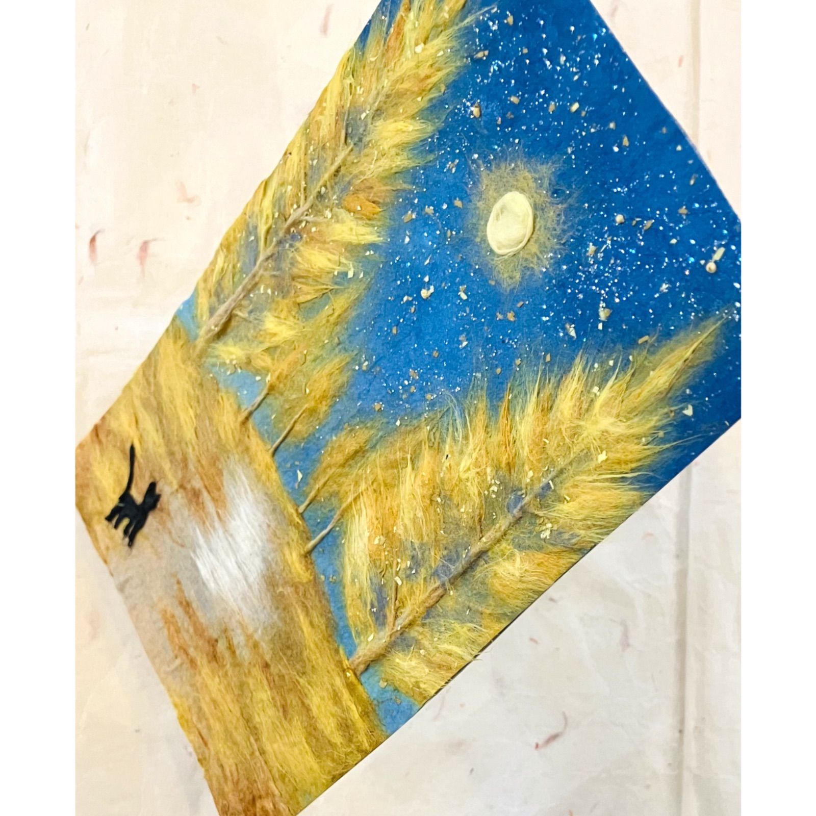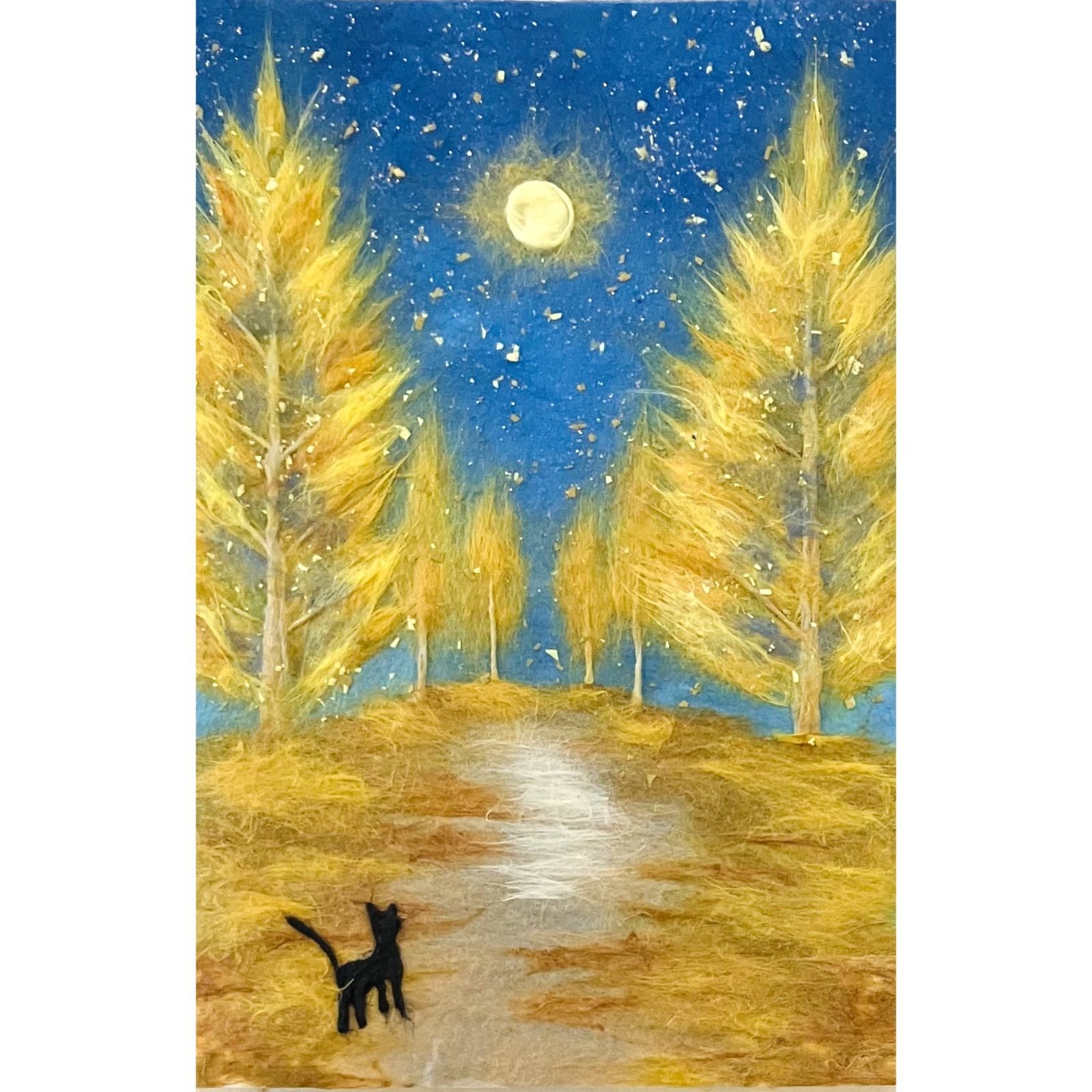 和紙ちぎり絵『イチョウ並木と黒猫』葉書サイズ原画