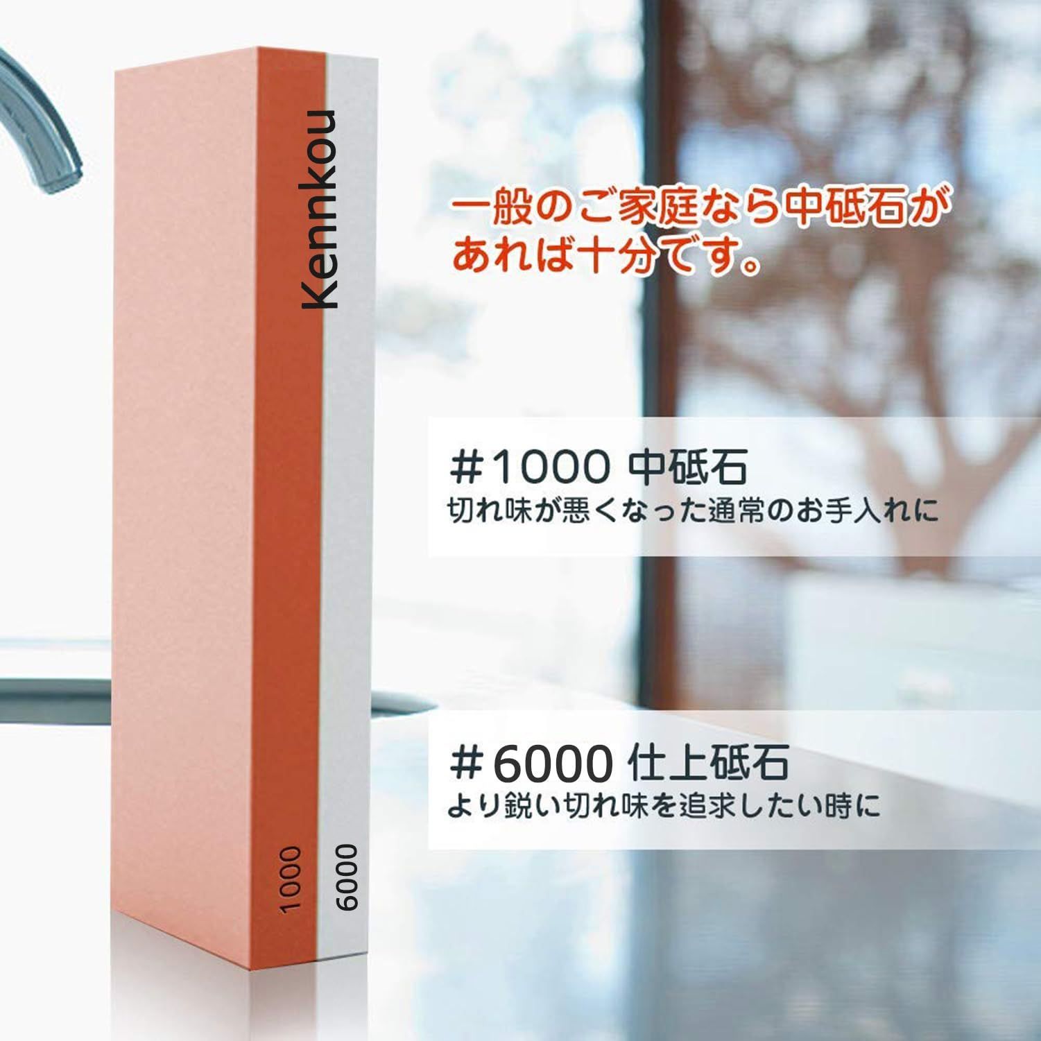 【中砥石&仕上げ両面砥石】:この両面砥石は1000の中砥石で、切れ味の悪い包丁や損傷した刃を一番鋭く研げる、6000の仕上砥石で、良い切れ味を追求したい時に役たちます、包丁をピカピカするには楽々。