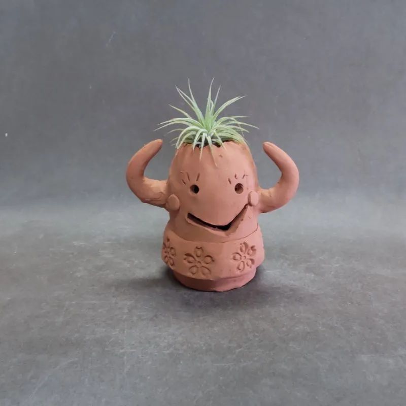 テラコッタ製の笑顔のキャラクター鉢、エアプランツに最適。