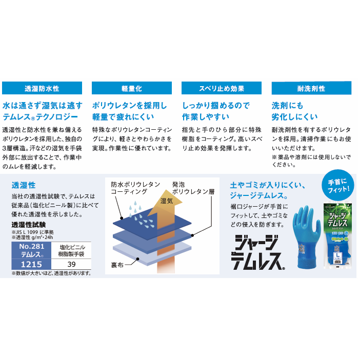 ● 透湿性と防水性を兼ね備えたポリウレタンをコーティングし、汗などの湿気を手袋外部に放出することでムレを軽減。