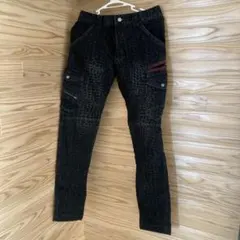 アースグリーンのカーゴパンツ、ウエスト85cm、股下78cm、ポリエステル65%、綿35%の素材。