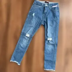 ウエストゴムのデニム長ズボン、細身ですがストレッチ素材で動きやすいデザインです。