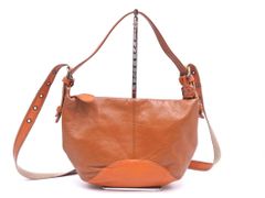 レザーのフラップ式ショルダーバッグ、外側にファスナーポケット付き。斜めがけできます。