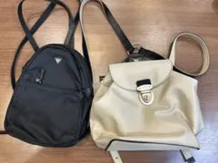 ネイビーの合成皮革製、ドローストリング式リュック。