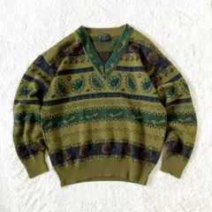 ヴィンテージ ベージュ ボーダー 幾何学 模様 レトロ ニット ポロシャツ