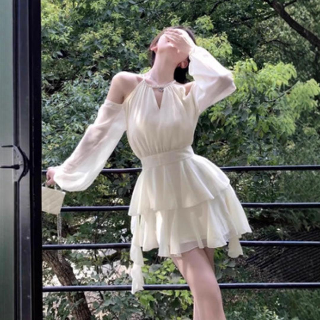 肩出し ワンピース パーティードレス セクシー フリル オフショルダー 白