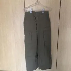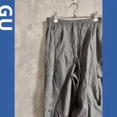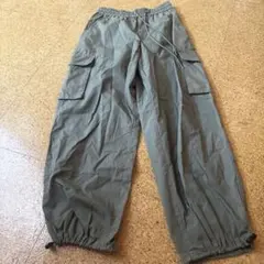 ウエストゴムデザインの黒いカーゴパンツ、後ろに2つのポケット付き。