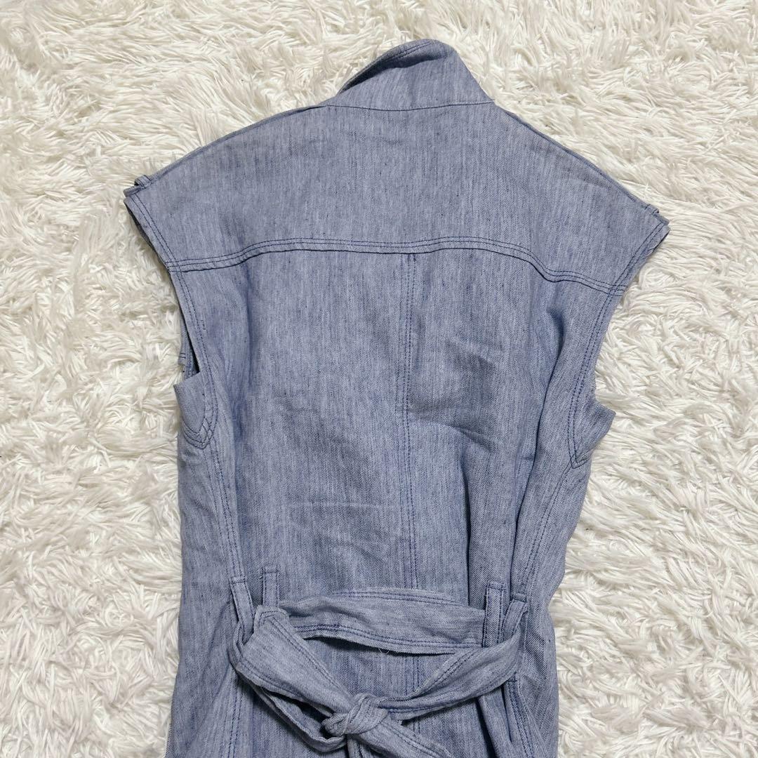 デニム風のノースリーブワンピース、肩のボタンが特徴的です。