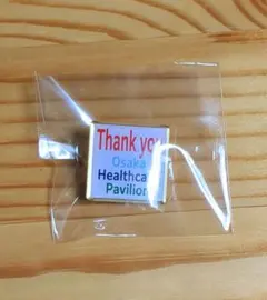 大阪ヘルスケアパビリオンの感謝のピンバッジ、正方形デザイン。