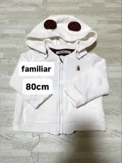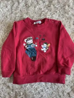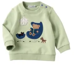 ファミリアのロンドン柄トレーナーです。グレーの生地に、ロンドンの街並みとクマのキャラクターが刺繍されています。肩にはスナップボタンが付いており、着脱しやすいデザインです。