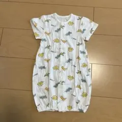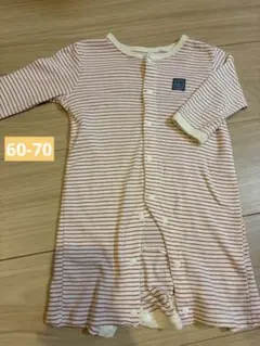 ストライプ柄のコットンロンパース、前面ボタン留めでポケット付き。