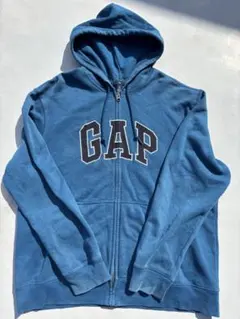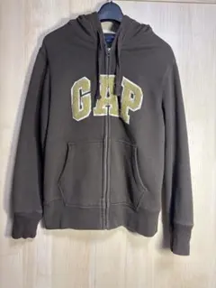 オリーブグリーンのGAPジップアップパーカー、フード付きでフロントポケットあり。