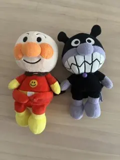 アンパンマンとバイキンマンのぬいぐるみセット、かわいいお菓子の形の小物付き。