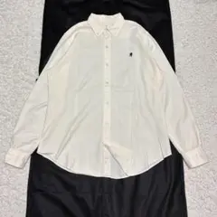 ジムフレックスの丸襟のボタンダウンシャツです。縦の縞のように見える生地です。ダンガリー生地のようですが定かではありません。