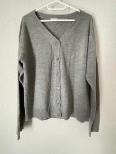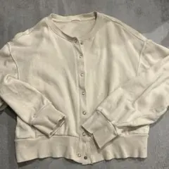 アイボリーのケーブルニットカーディガン、フロントボタン式で長袖。