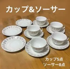 - デザイン: 緑色の装飾と金の縁取りが施されたティーカップとソーサー