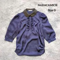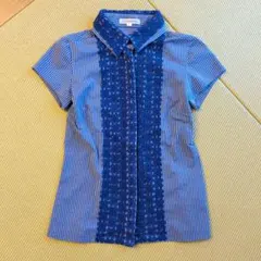 【ナラカミーチェ】 フリルブラウス M ストライプ柄 ストレッチ 半袖 ブルー