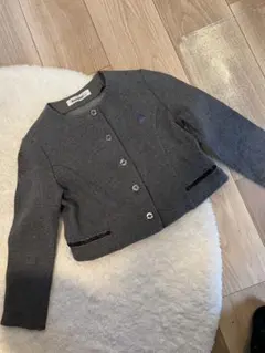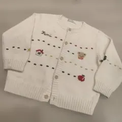 クマとウサギの刺繍が施されたグレーのカーディガン、サイズ100cm、木製ボタン付き。