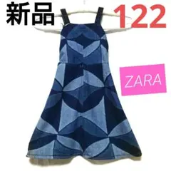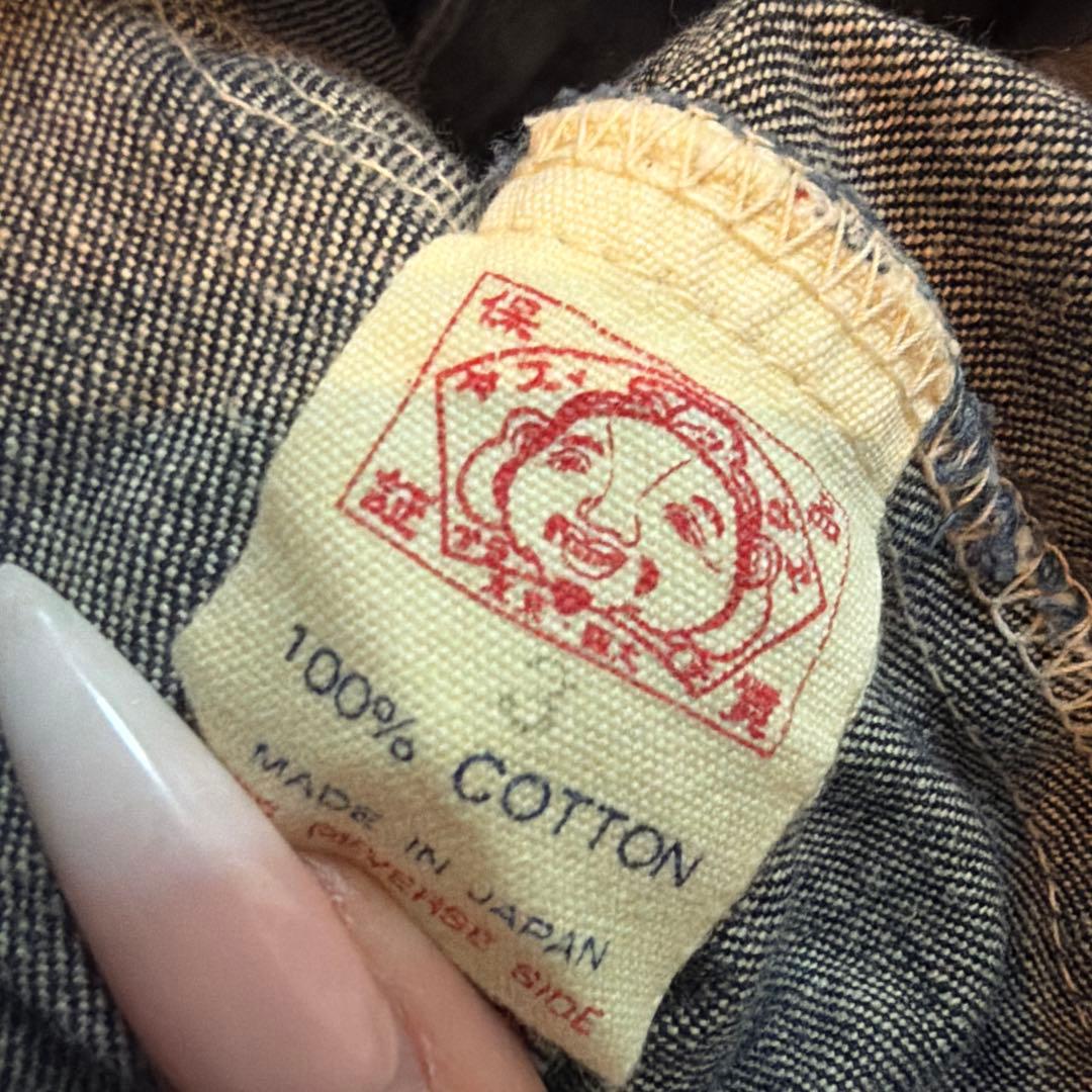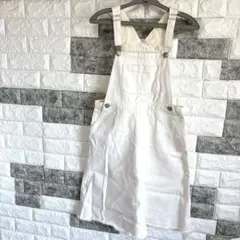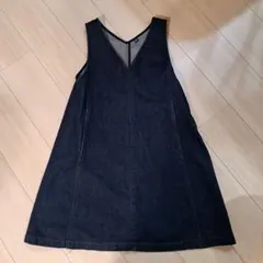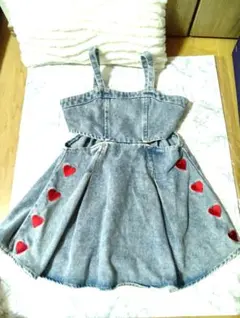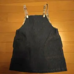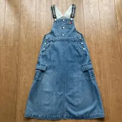 希少。デニム素材のジャンバースカート、前面にマークの刺繍と2つのポケット付き。