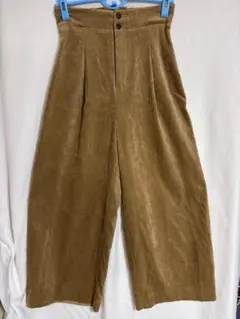 ブラウンのコーデュロイ素材、ウエストゴム付きのイージーパンツ。
