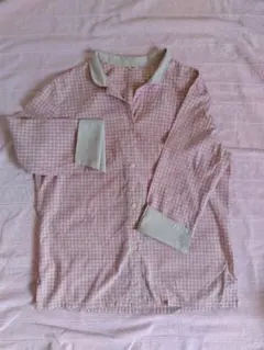 アイボリーのリボン付き五分袖シャツ、ギャザー入りバックデザイン。