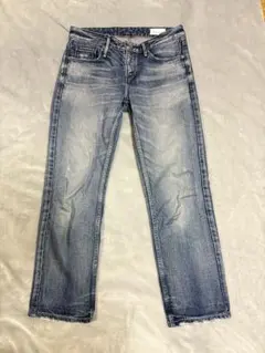 しっかりとストレッチが効いている点も嬉しい。9分丈の為、お直しいらずで、足元がすっきり軽快な履き心地を楽しめます。 程良い色落ち、ダメージ加工が上品なインディゴカラー。絶妙な濃淡で、さらにスタイルアップ効果があります。 飽きのこない、万能な1本です。
