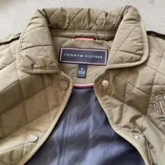 アメリカで購入したトミーヒルフィガーのネイビーのフード付きキルティングジャケットです。フロントはファスナーとメタルボタンの二重式です。裏地はなく、フードは脱着可能ではありません。後にスリットが入っています。